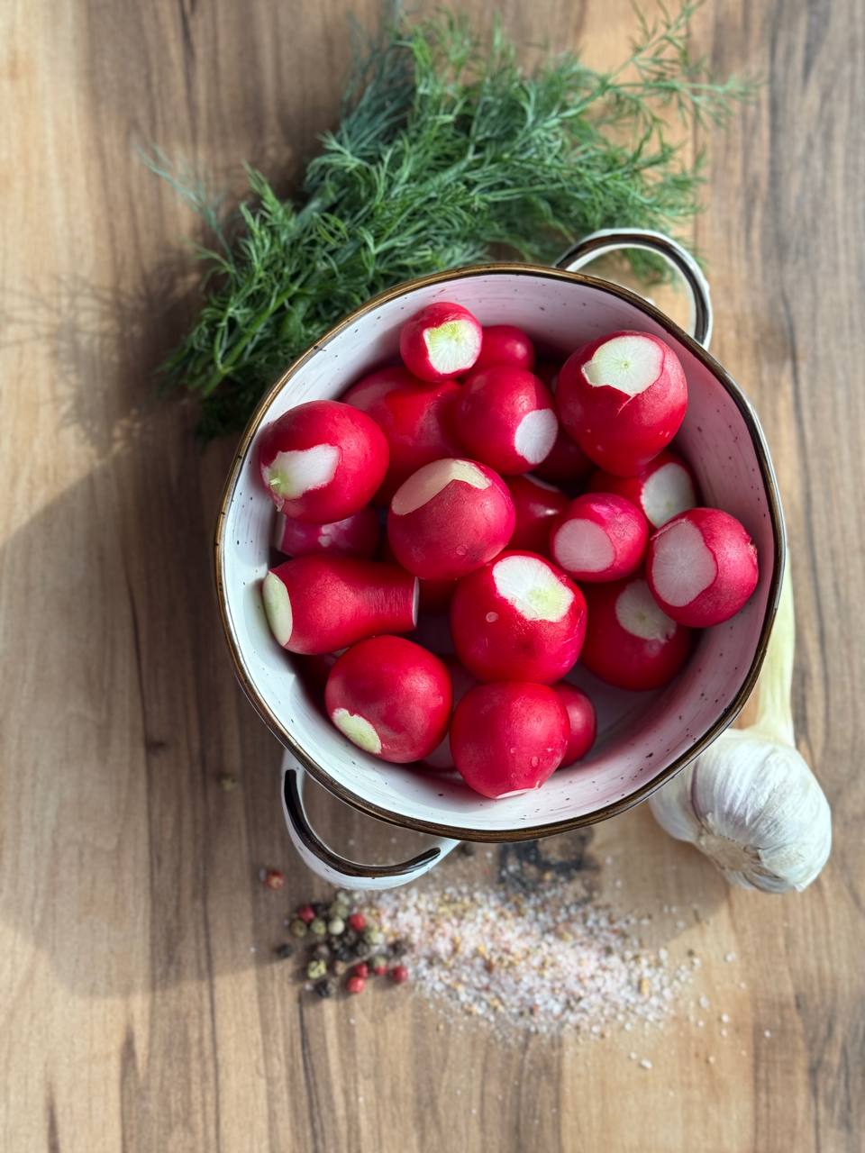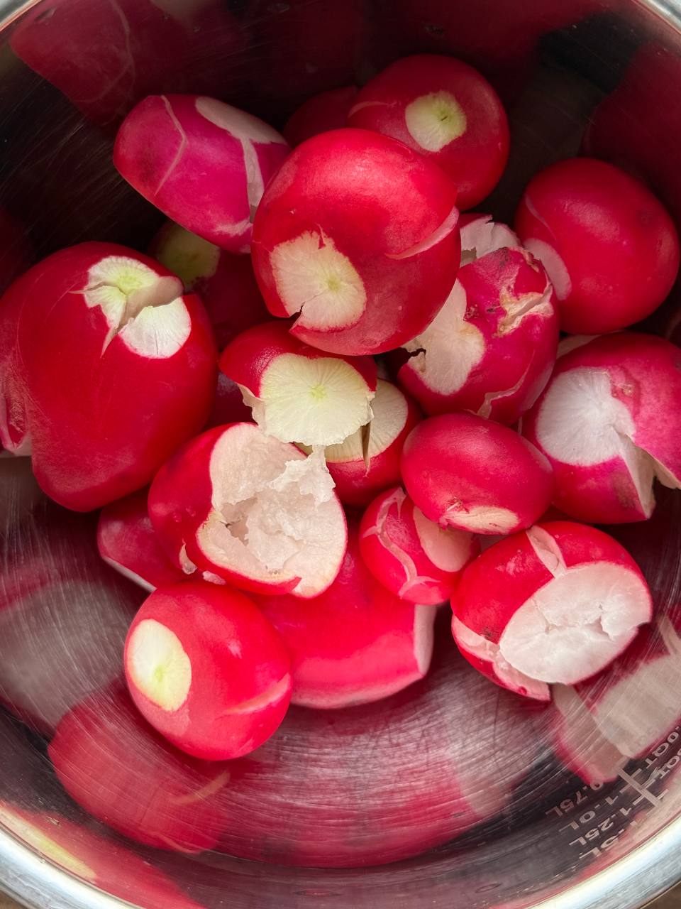- Тщательно промойте редиску, удалите лишние части и слегка расплющите каждую редиску