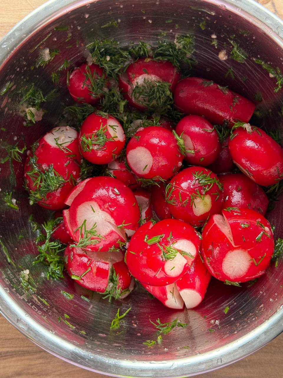 - В глубокой миске соедините редиску, укроп, чеснок, уксус, оливковое масло, соль, сахар и ваши любимые приправы
