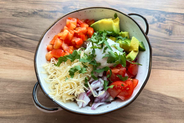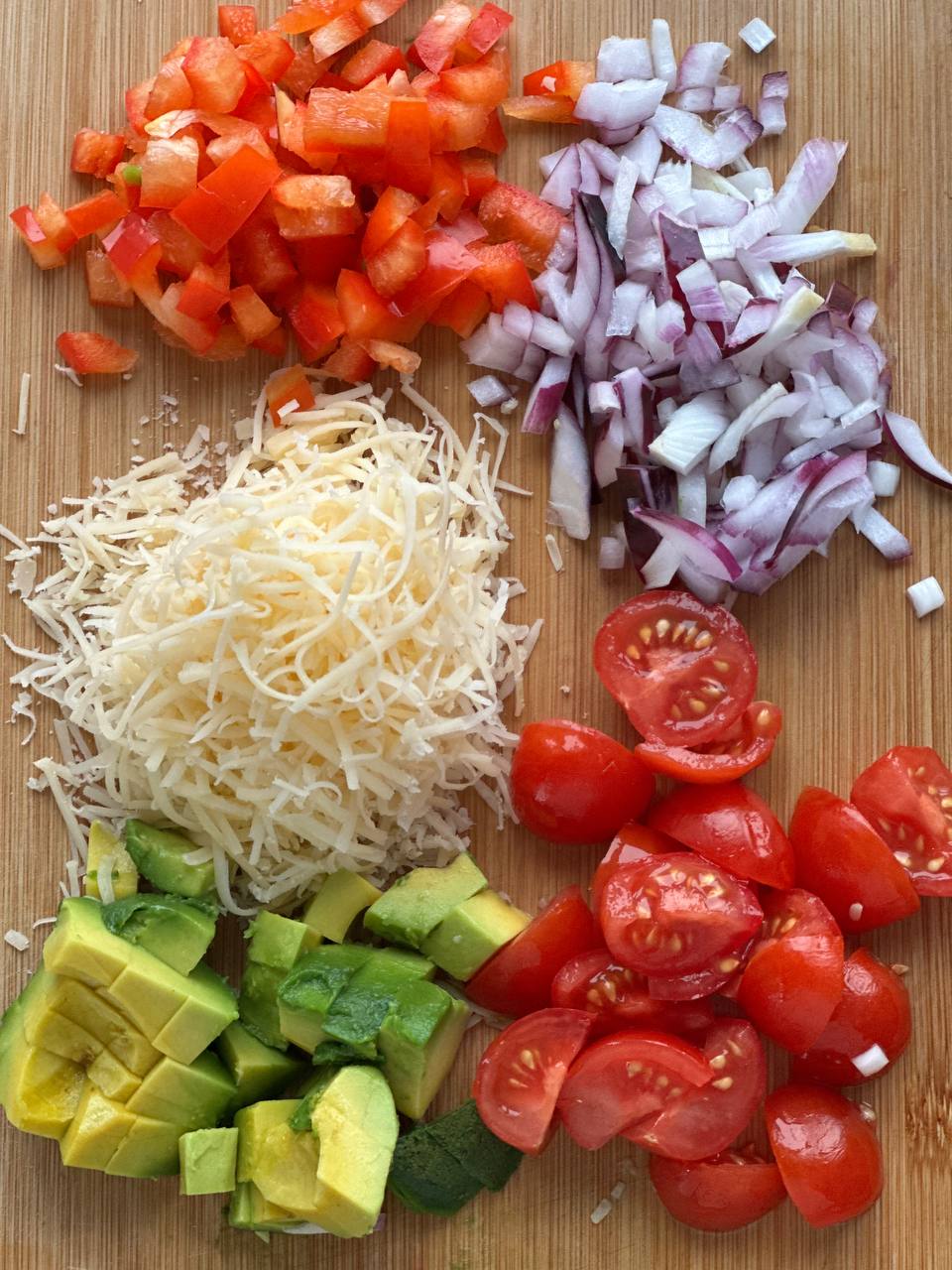 - Режем томаты на 4 части , лук авокадо и перец - кубиками. Авокадо предварительно можно сбрызнуть лимонным соком