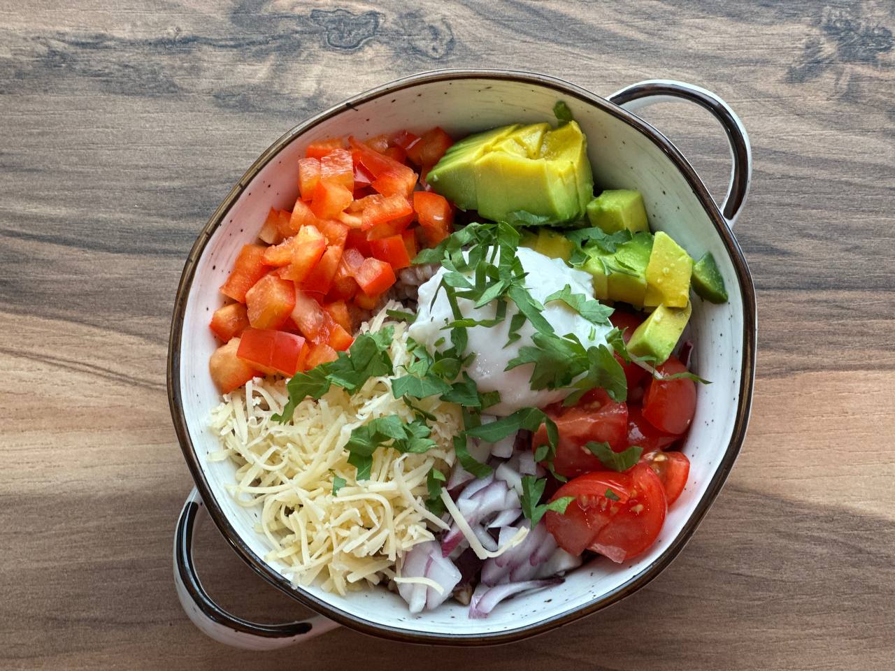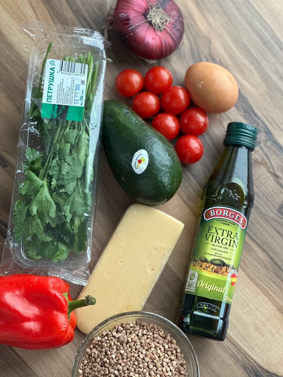 - В глубокую тарелку выкладываем гречу, поливаем оливковым маслом. Сверху выкладываем остальные ингредиенты