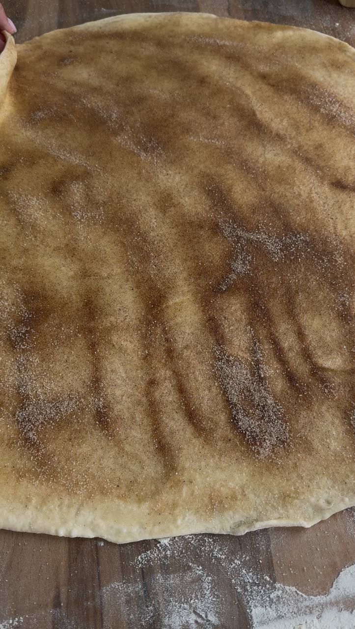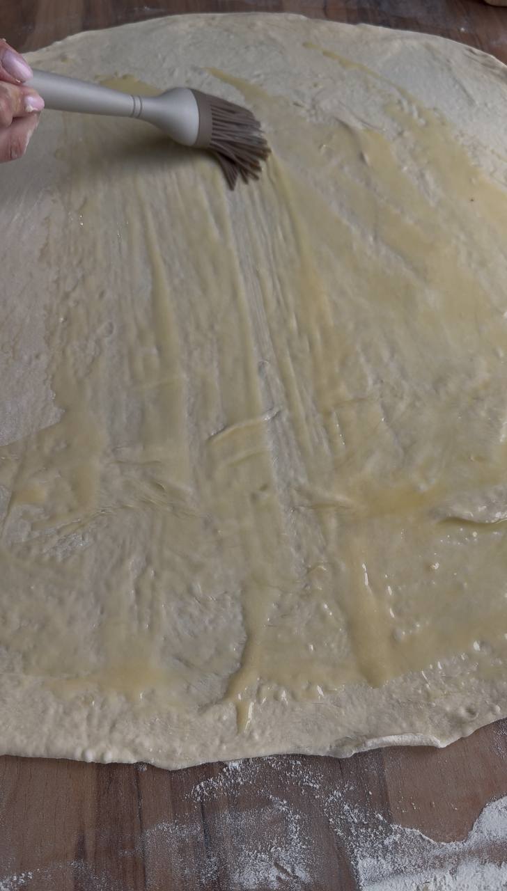 - Намажьте поверхность растопленным сливочным маслом и посыпьте сахаром с корицей (или только сахаром, или сахаром с маком по желанию).