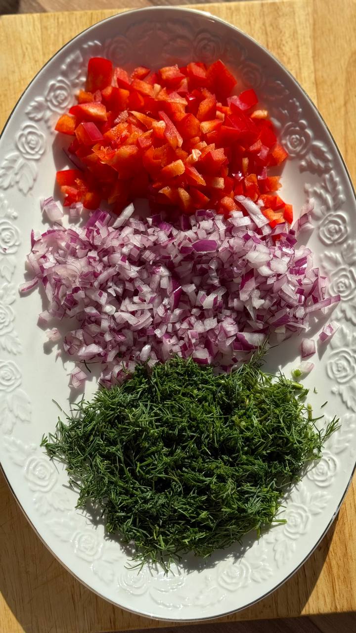- Сладкий перец и ялтинский лук мелко нарежьте.