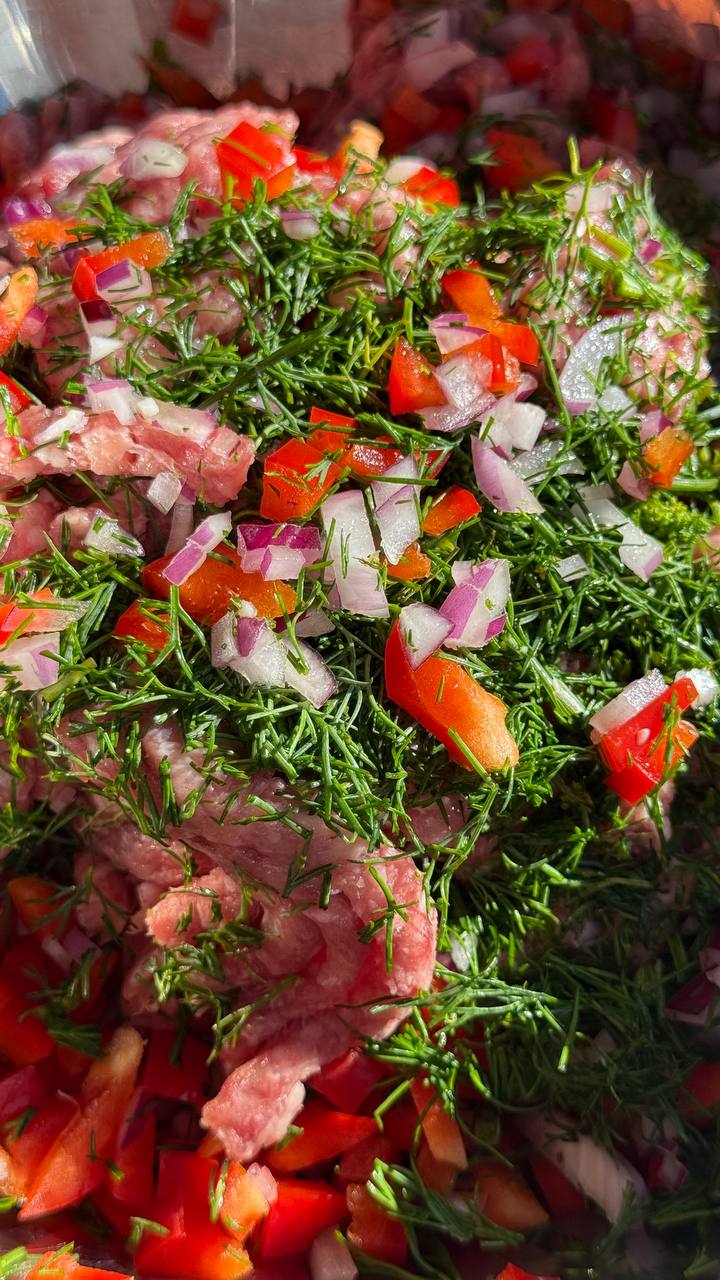 - В глубокой миске смешайте фарш с нарезанными овощами и зеленью.