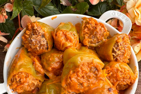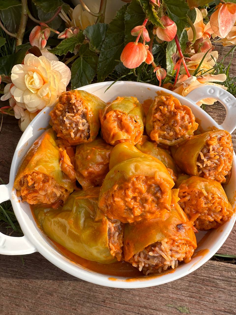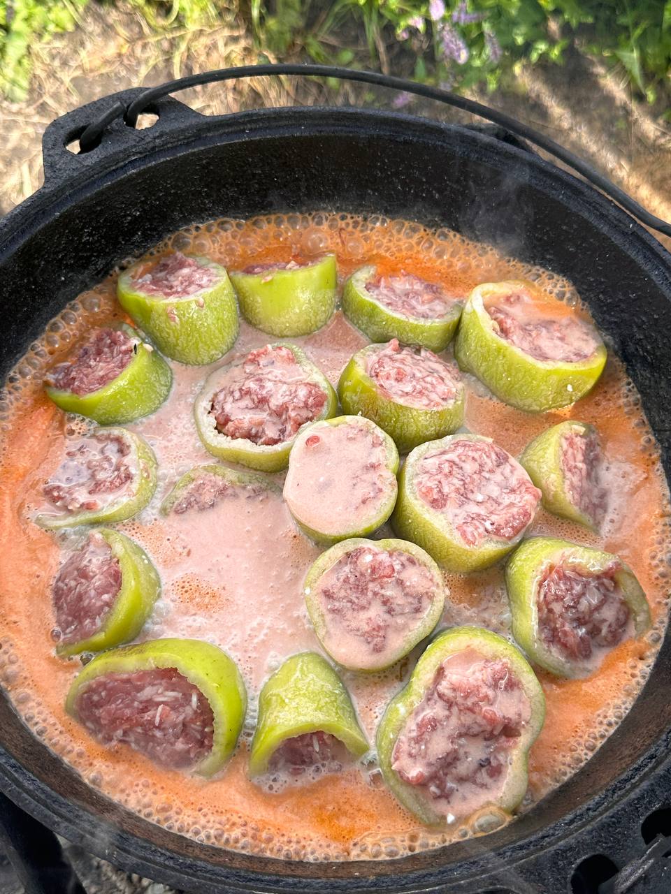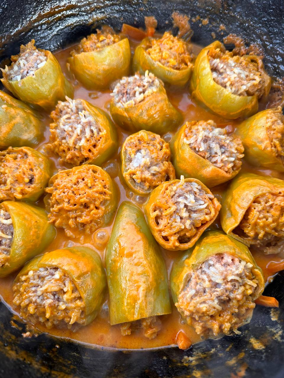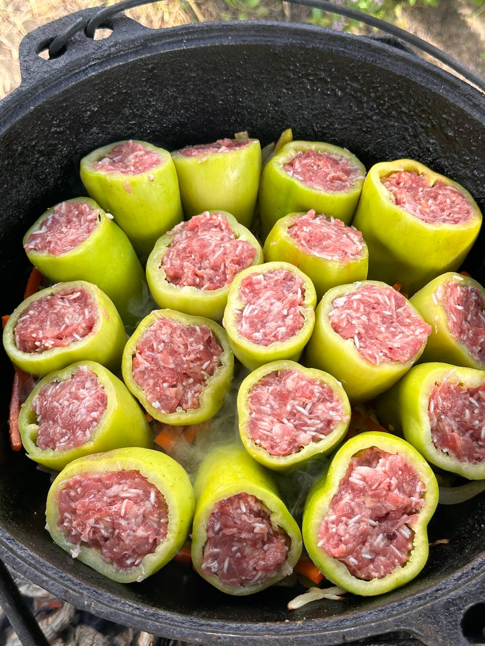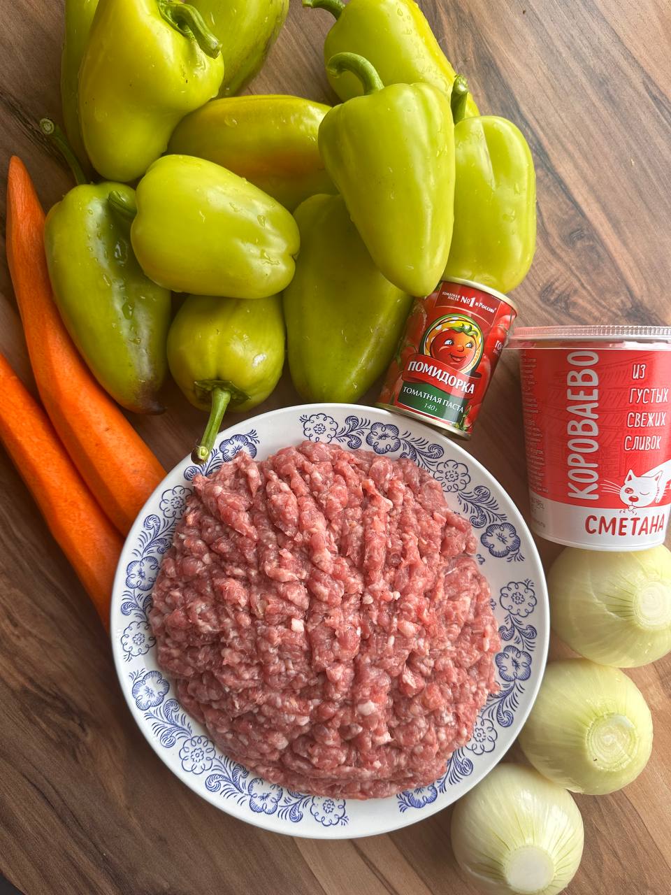 - Закладываем фарш в перцы и выкладываем их к зажарке. Все заливаем соусом из сметаны, томатной пасты и воды (соль и специи - по желанию)