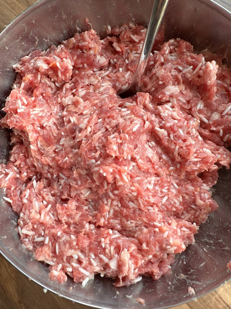 - Рис промываем и замачиваем на 20-40 минут. Затем смешиваем с фаршем и добавляем соль по вкусу.