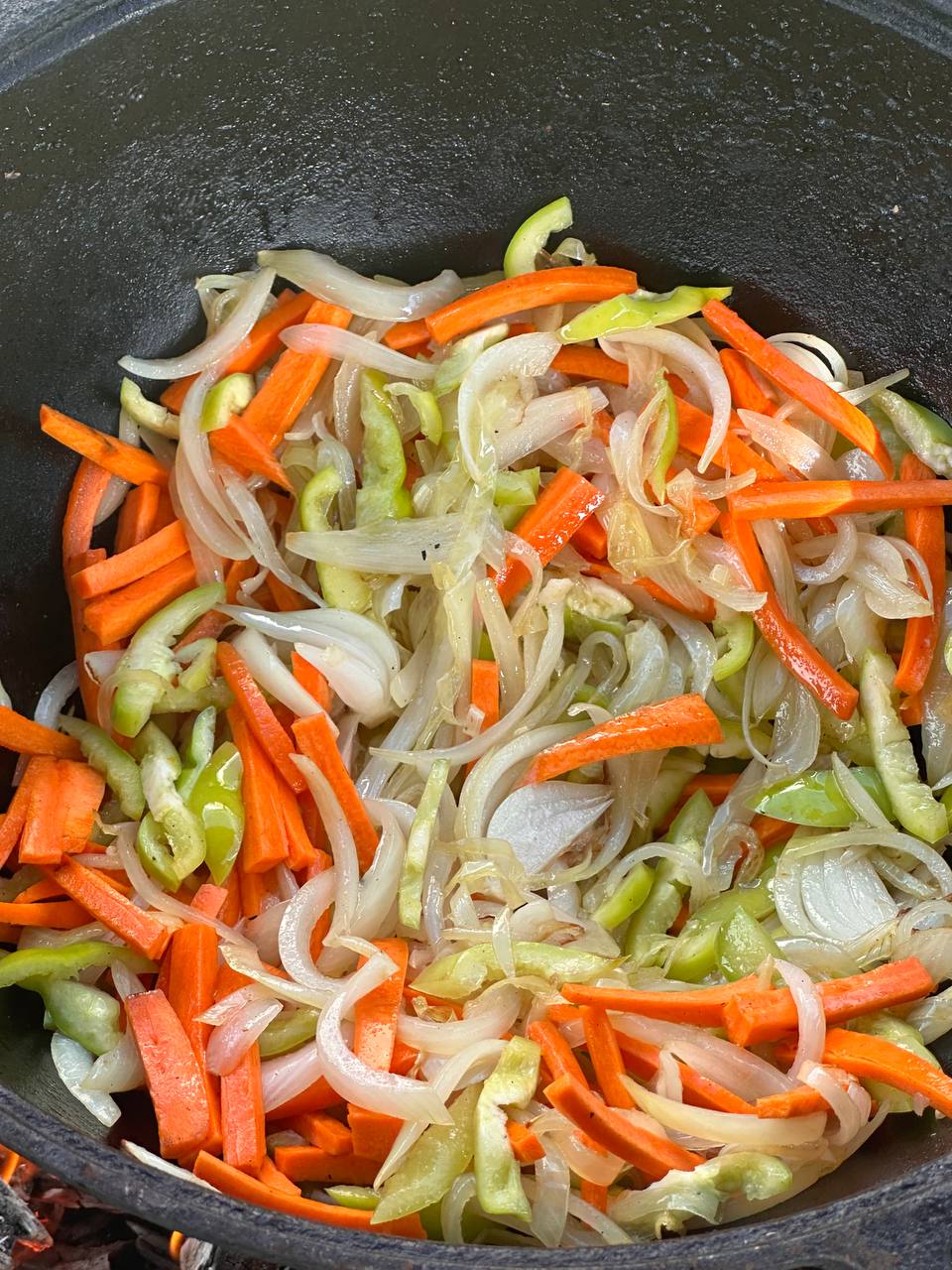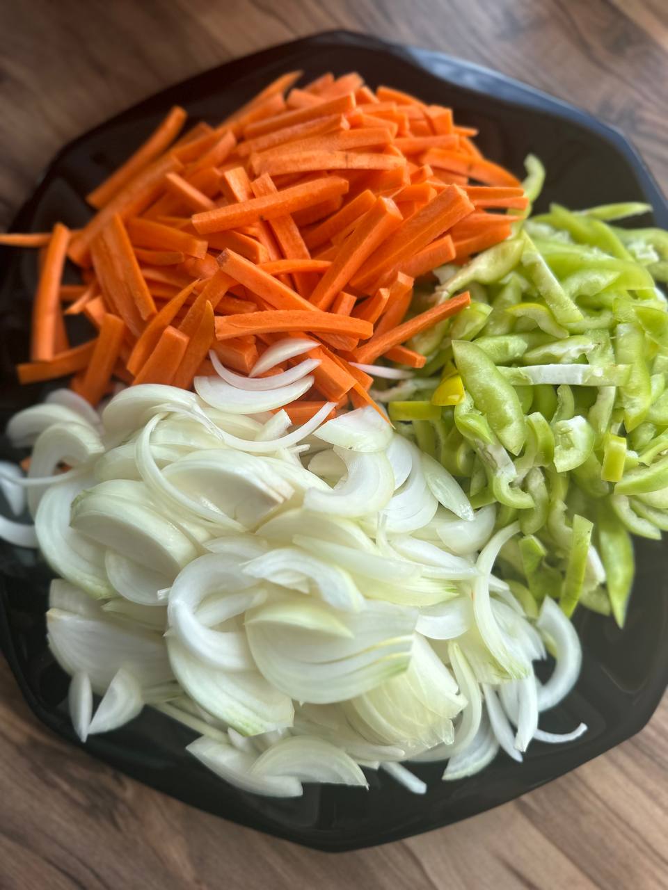 - Для зажарки нарезаем лук - перьями, морковь - брусочками, шляпки перцев - как получится и обжариваем овощи в масле.