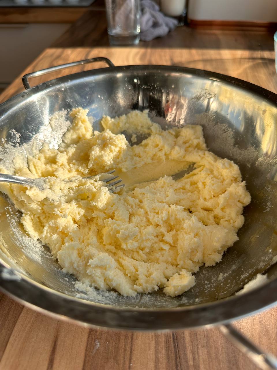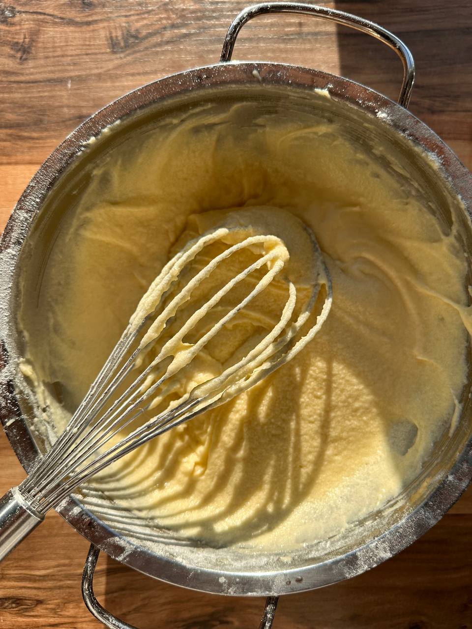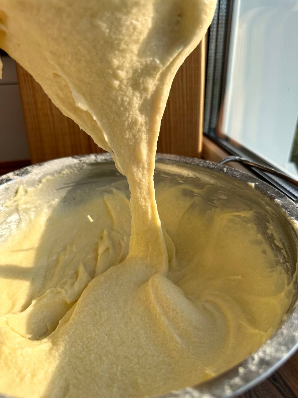 - Все хорошо перемешиваем. Тесто должно получиться текучим, но достаточно густой консистенции. При необходимости добавить еще чуть-чуть муки.