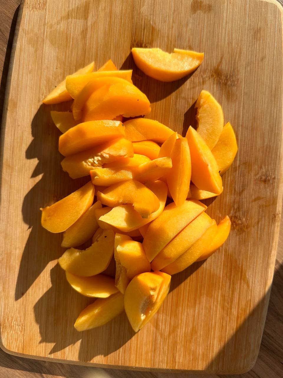 - Сок, который выделят персики смешается с сахаром и получится сироп. Тушим 3-5 минут до полуготовности фруктов. Лучше снять их с огня до того, чем они превратятся в джем.