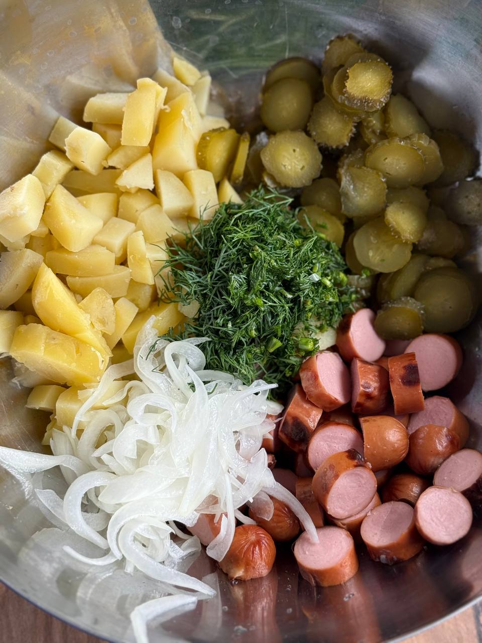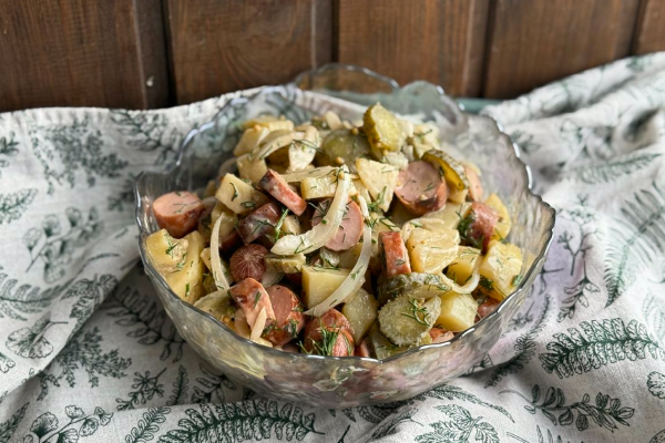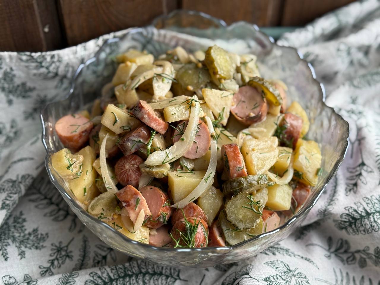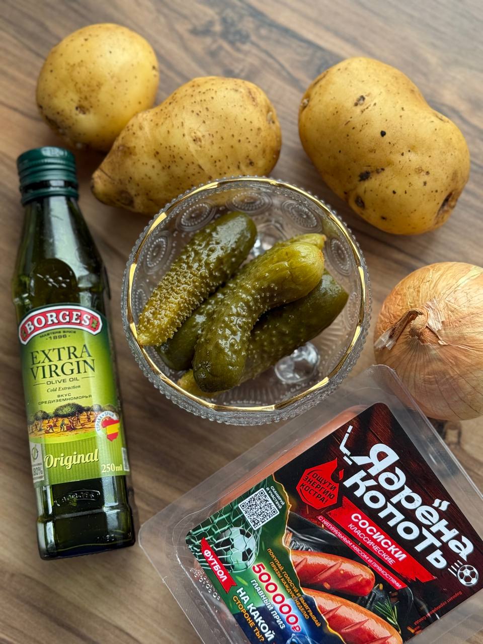 Картофельный салат с копчеными сосисками и маринованными огурцами