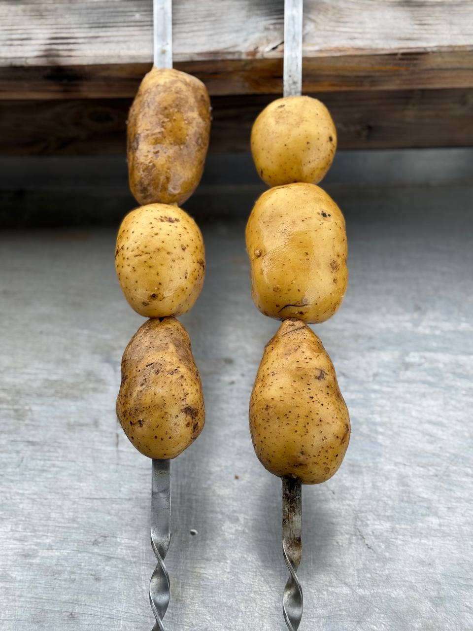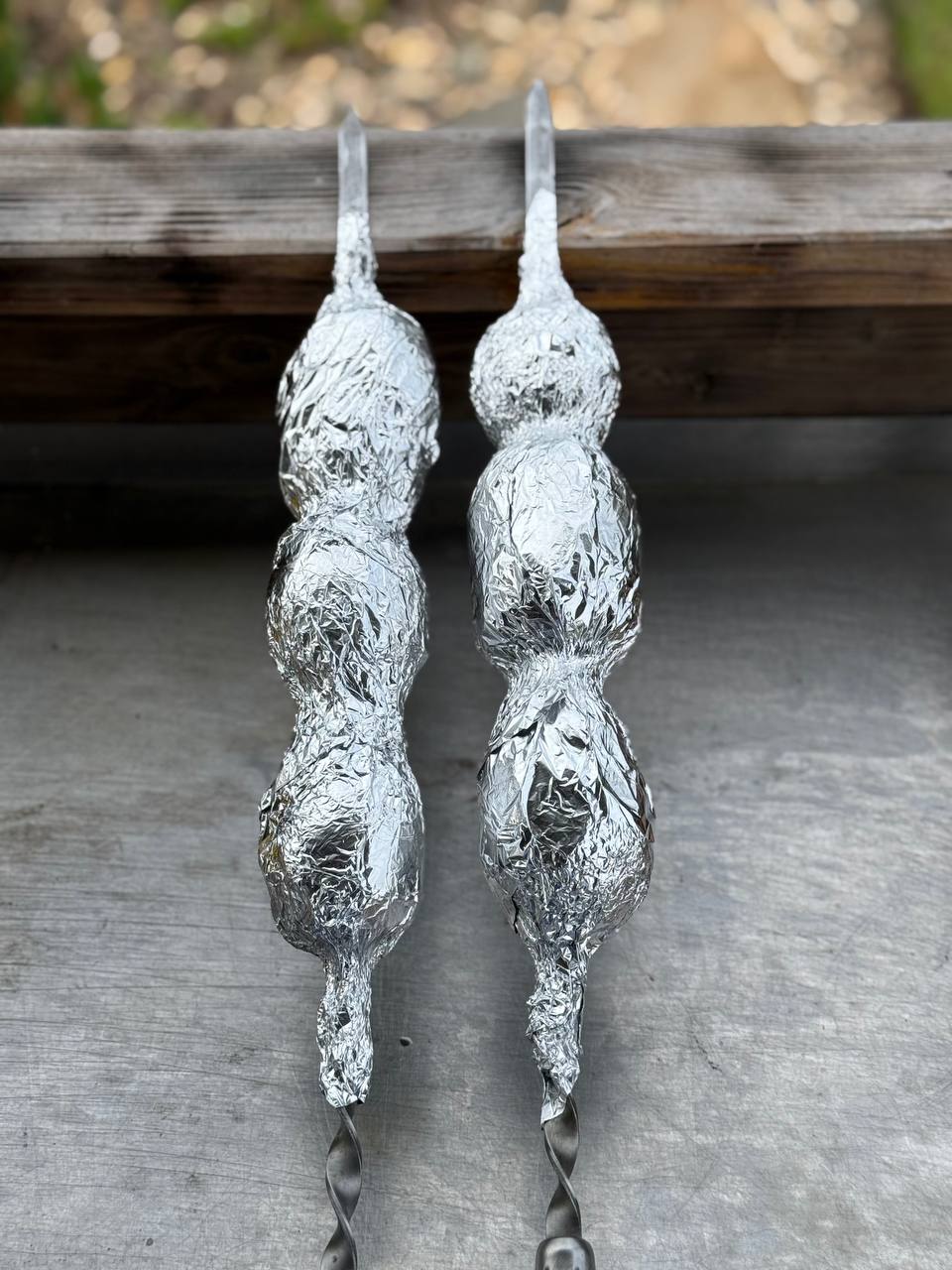 - Заверните в фольгу и запекайте на углях или в духовке до готовности (30–40 мин).