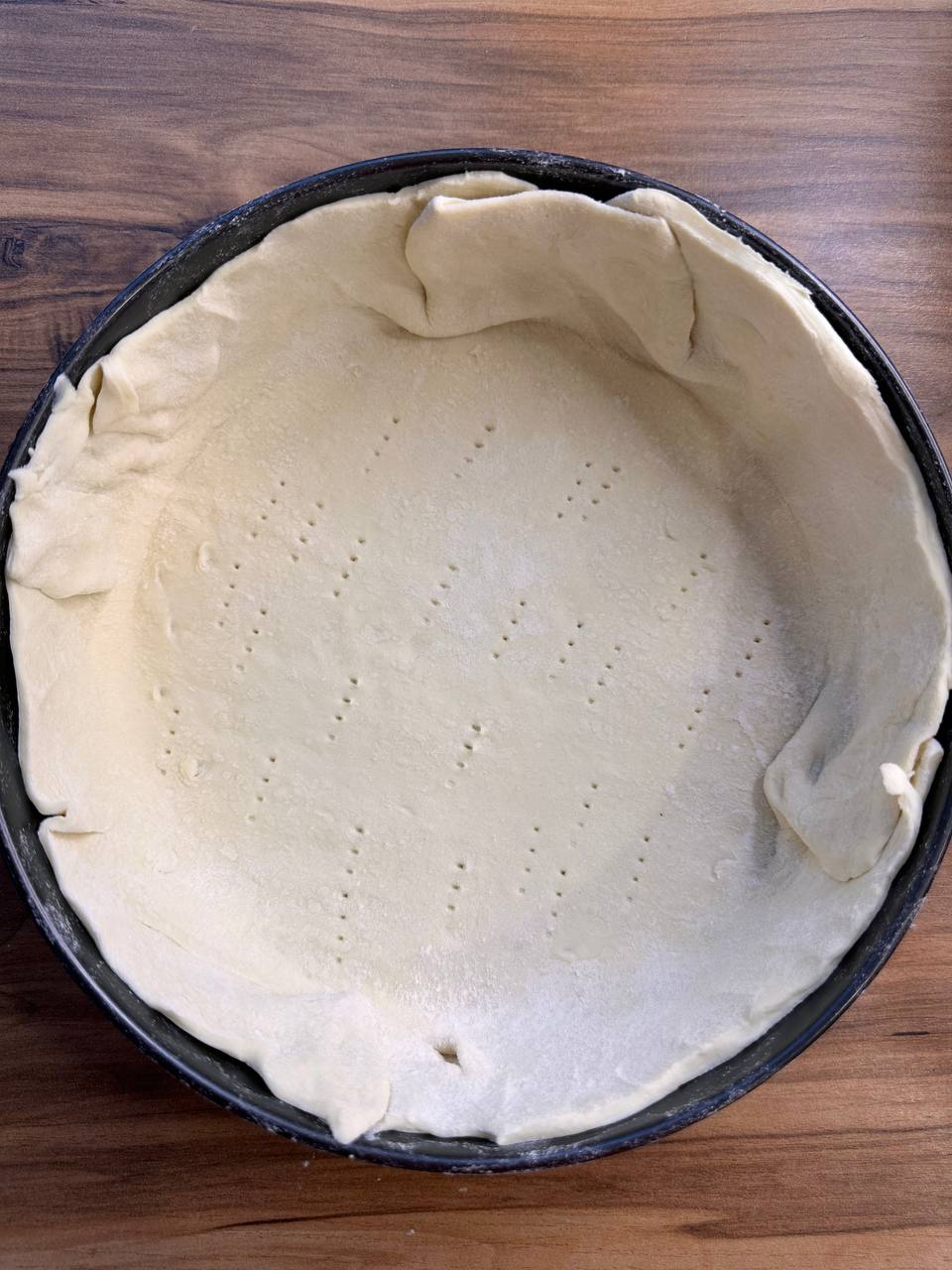 - Раскатываем тесто, укладываем в форму и делаем несколько проколов вилкой