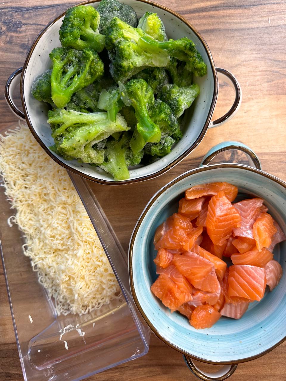- Заливаем брокколи и лосось полученной смесью, сверху посыпаем тертым сыром