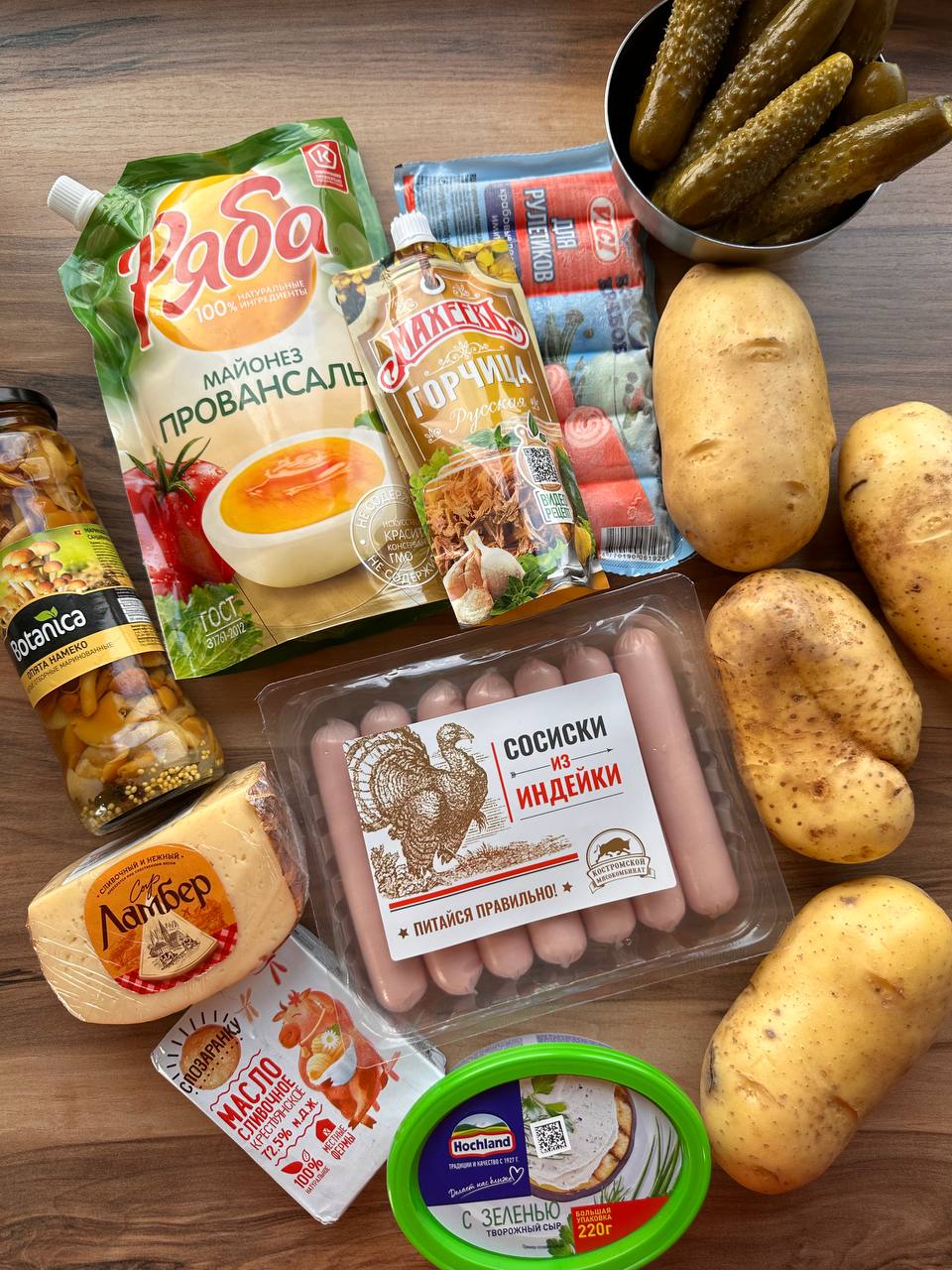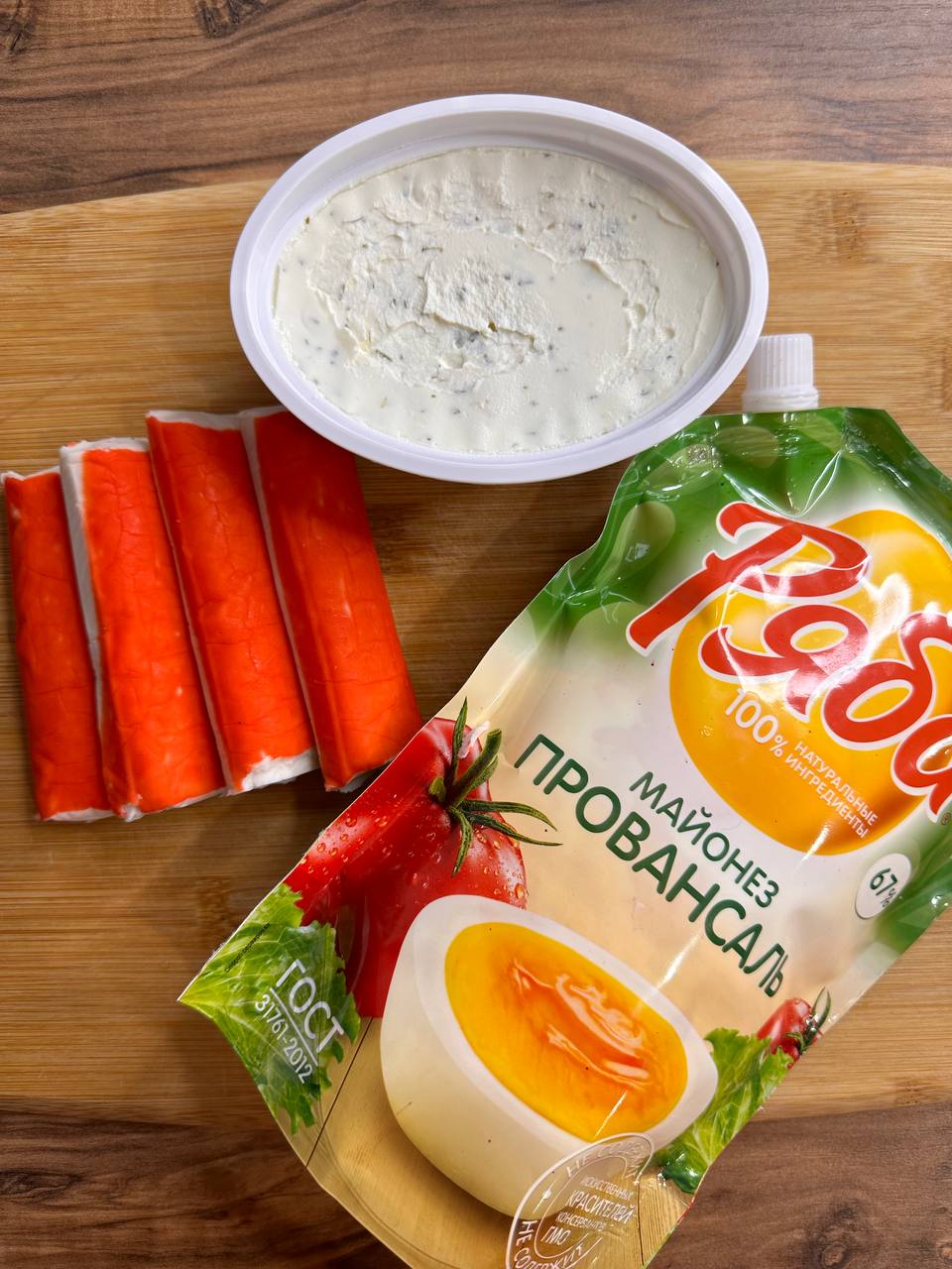 - Сосиски/вареная колбаса/ветчина и сыр, творожный сыр и майонез для соуса