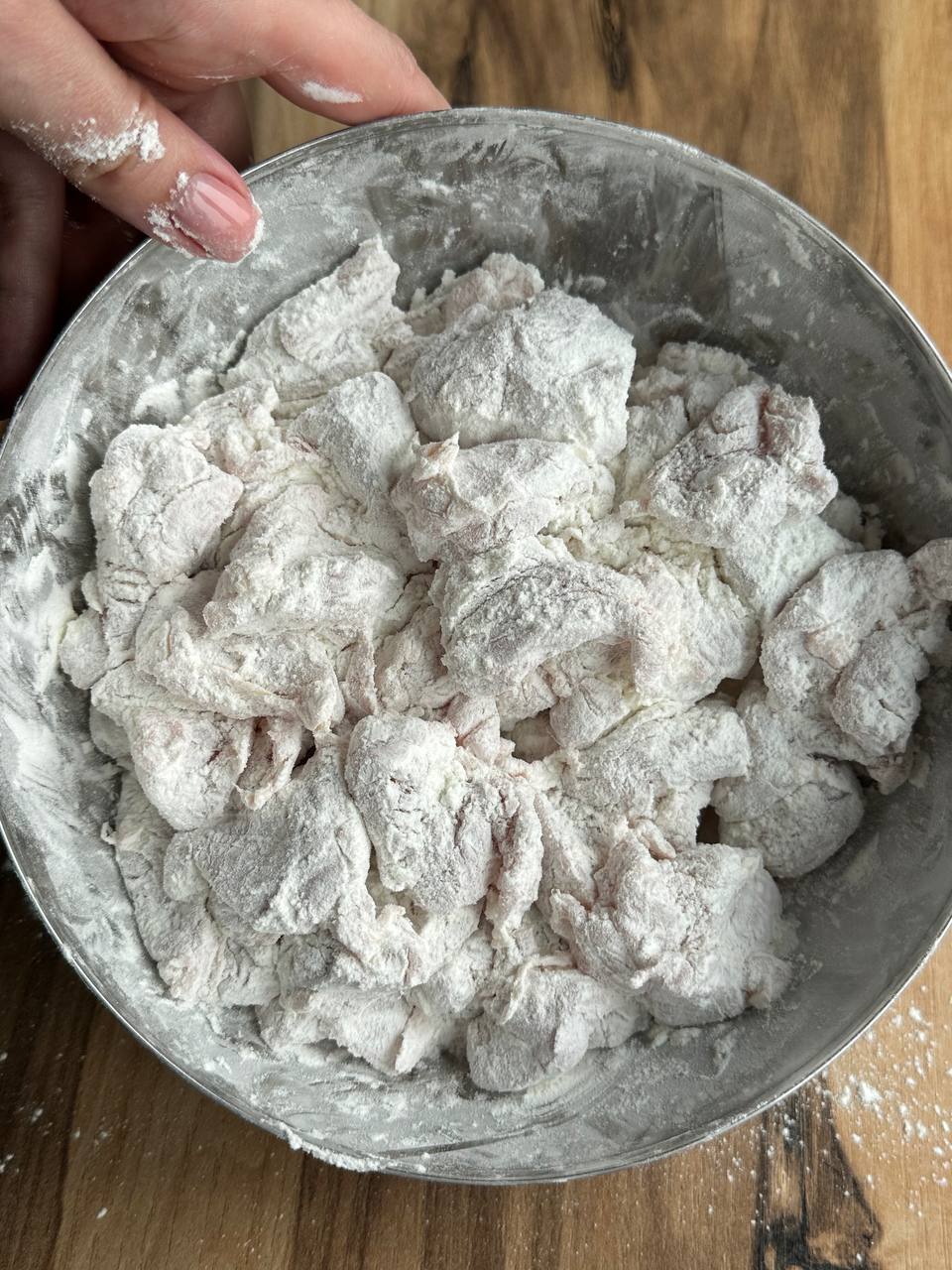 - Филе нарезаем небольшими кусочками и хорошо обваливаем в крахмале