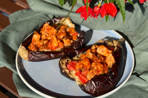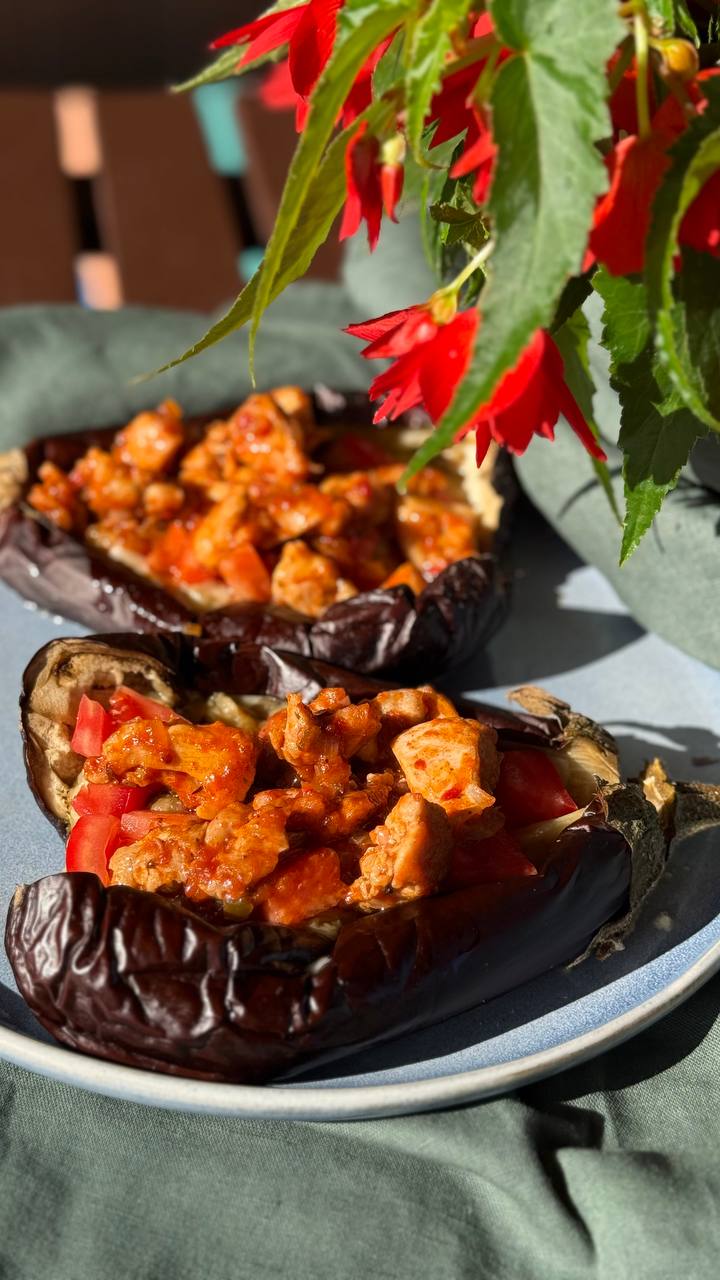 - Наполните подготовленные лодочки из баклажанов начинкой.