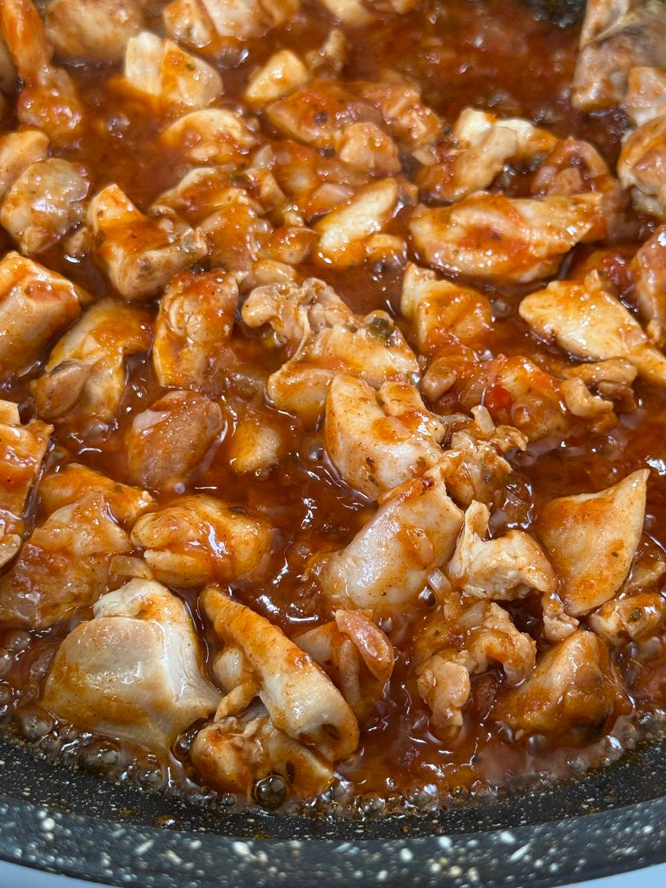 - В сковороде разогрейте оставшееся оливковое масло. Добавьте нарезанное кубиками филе куриного бедра и обжаривайте до золотистой корочки.