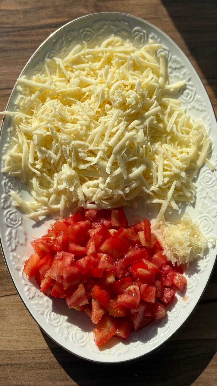 - Снимите с огня и добавьте кубики помидора и тертый сыр. Перемешайте до однородности.