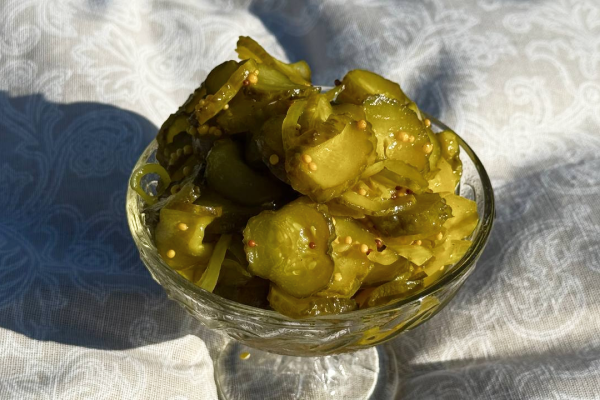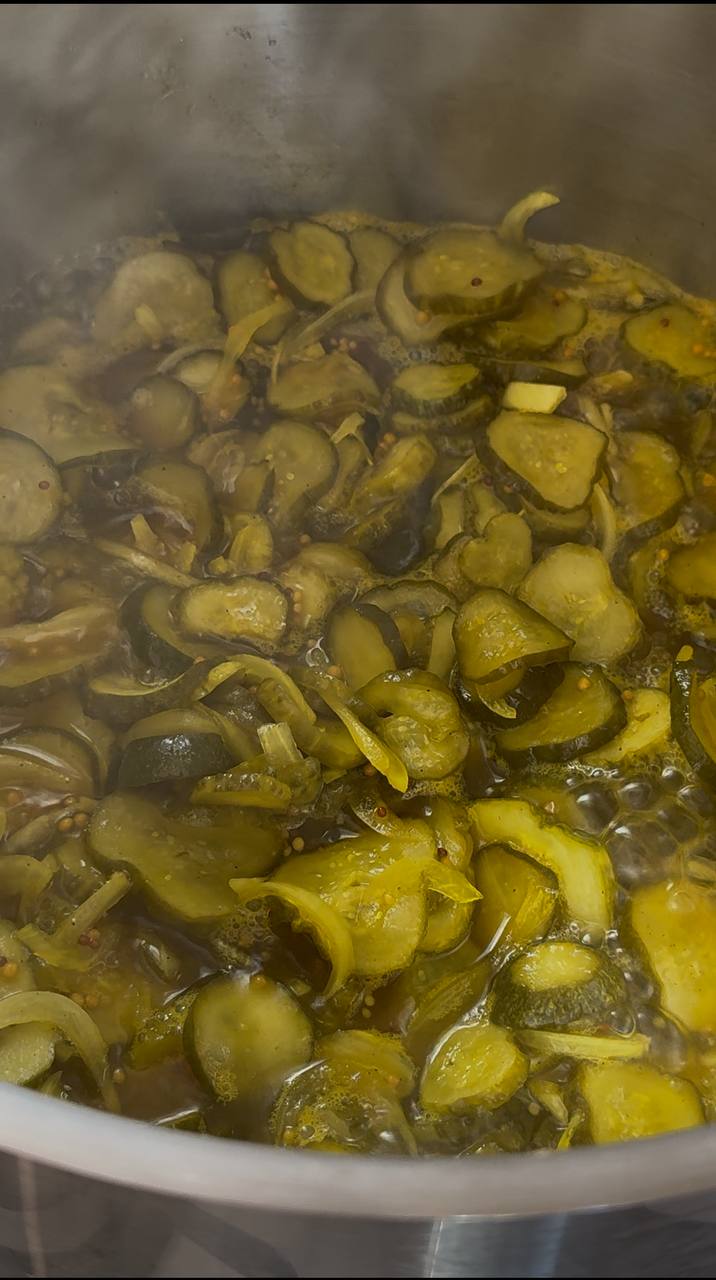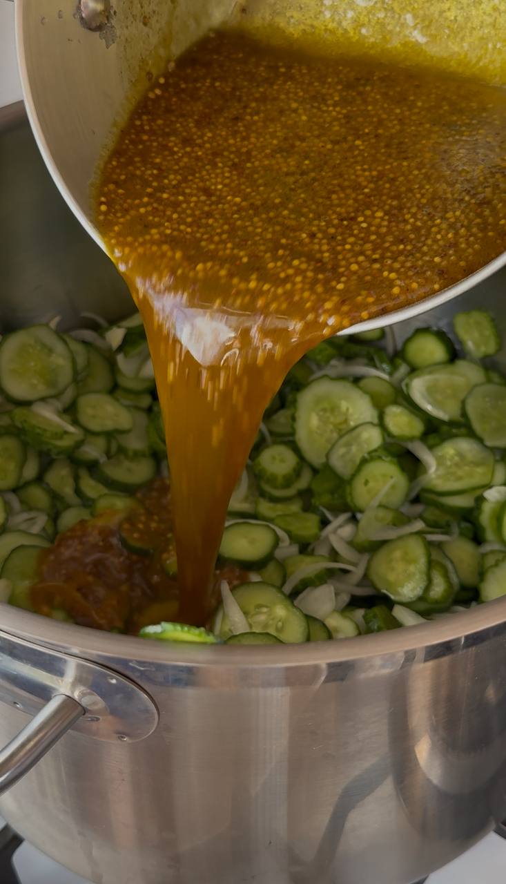 - Как только маринад закипит, добавьте к нему подготовленные огурцы. Снова доведите до кипения и варите в течение 4 минут.
