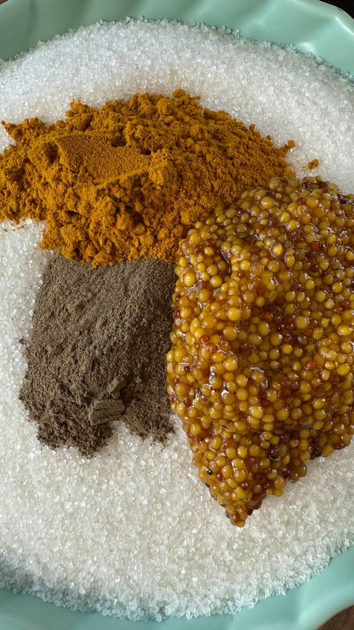 - В кастрюле смешайте уксус, сахар, куркуму, черный молотый перец и горчицу. Доведите смесь до кипения.