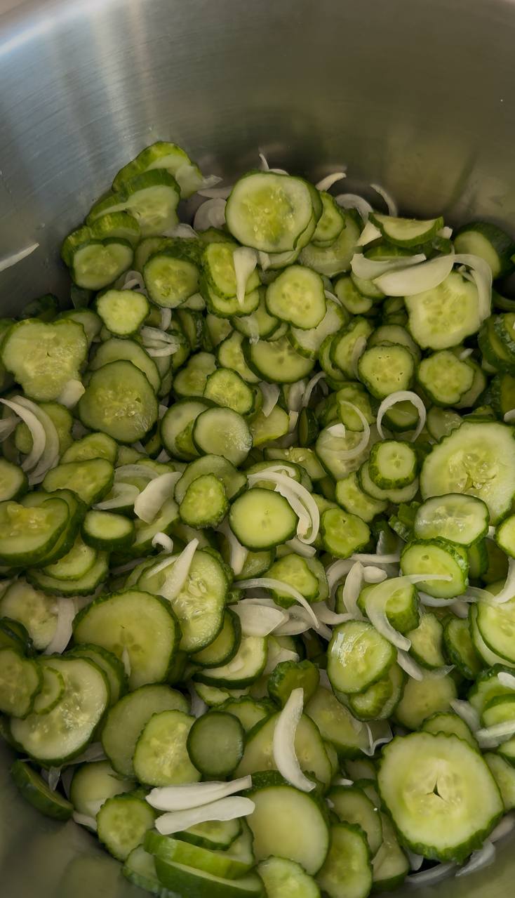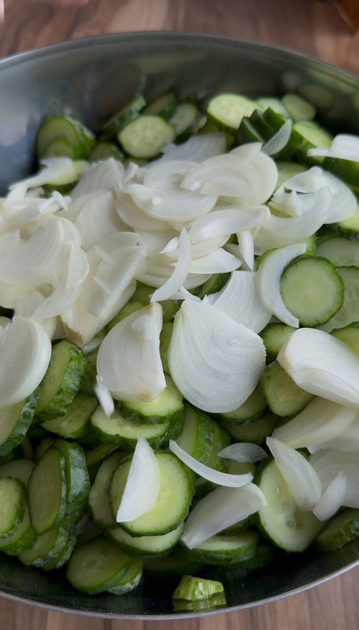 - Тщательно промойте огурцы и обрежьте кончики. Нарежьте их кружочками и добавьте нарезанный полукольцами лук. Посолите и хорошо перемешайте. Оставьте смесь на 2-3 часа, чтобы огурцы пустили сок.