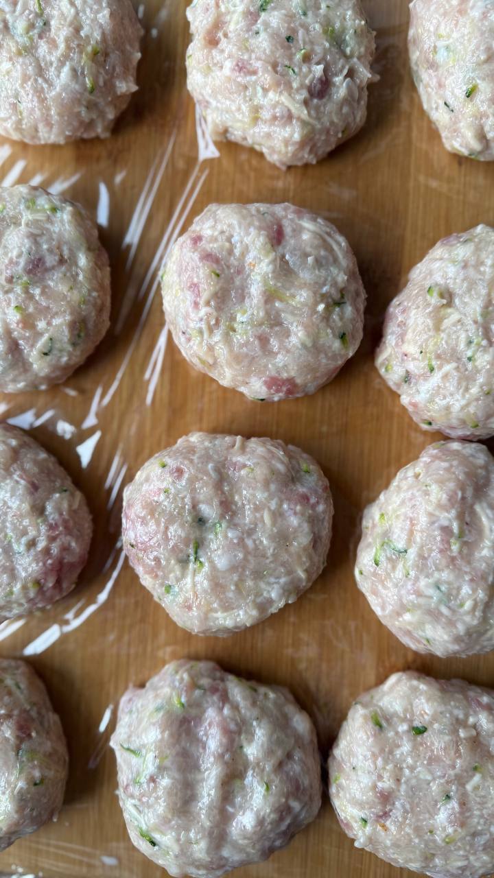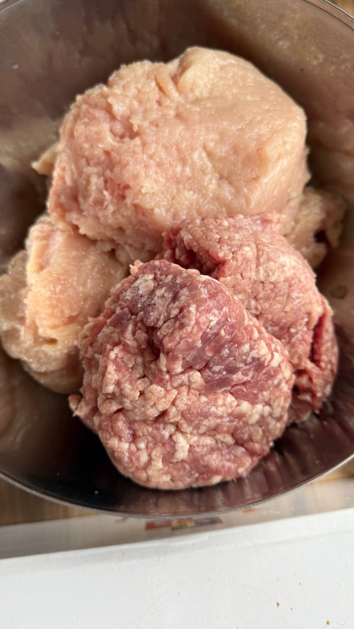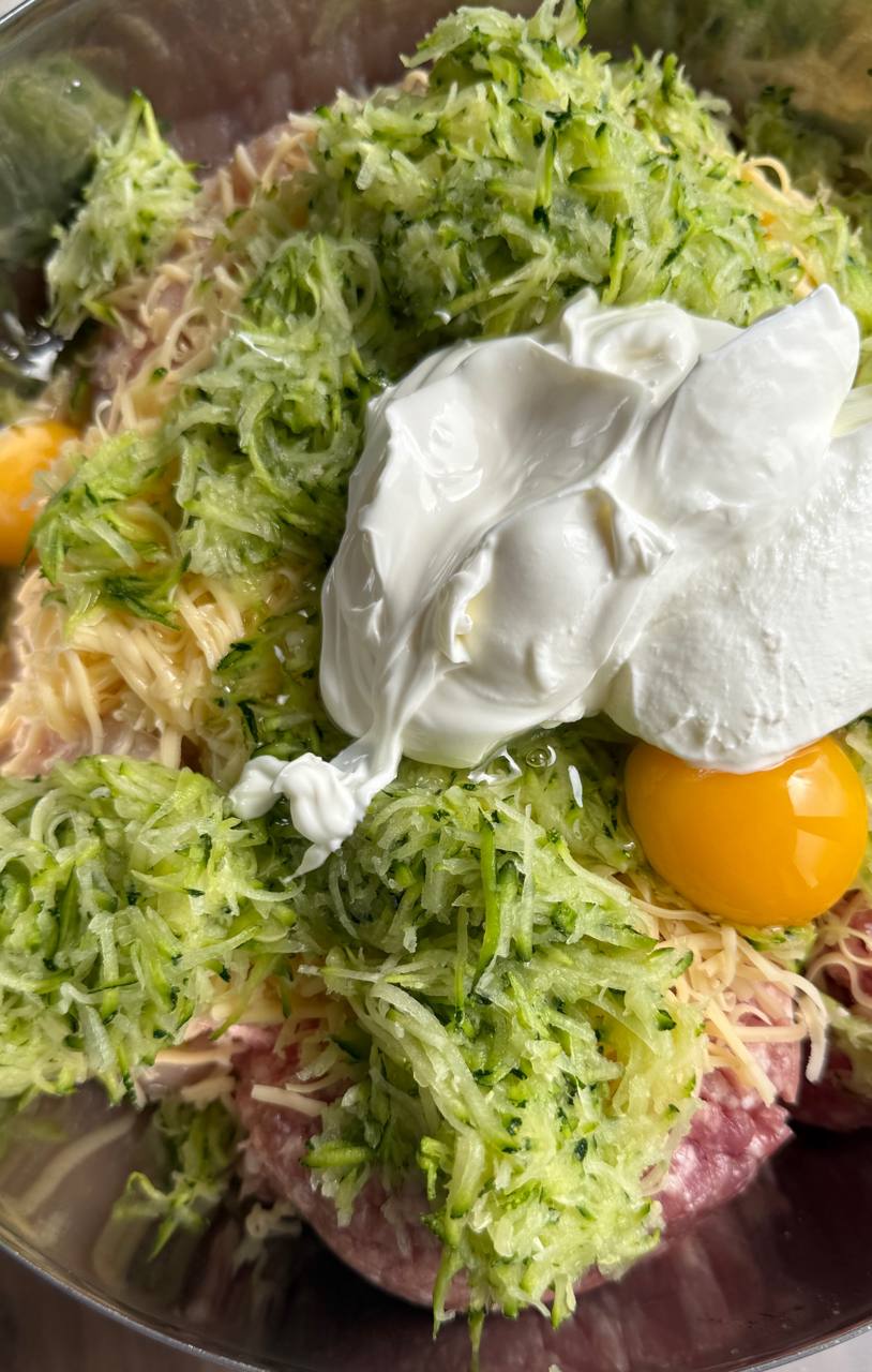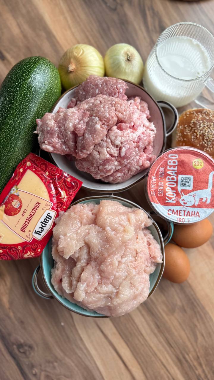 - В большой кастрюле объедините куриный и свиной фарш, размягченный хлеб, нарезанный лук, тертый сыр, отжатый кабачок, яйца и сметану. Хорошо посолите и поперчите по вкусу. Тщательно перемешайте массу до однородности.