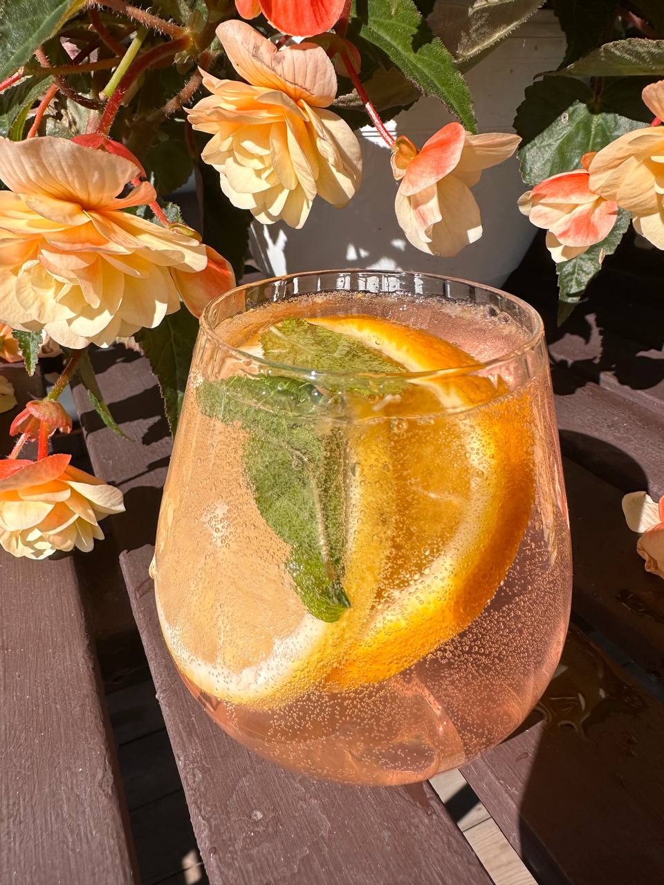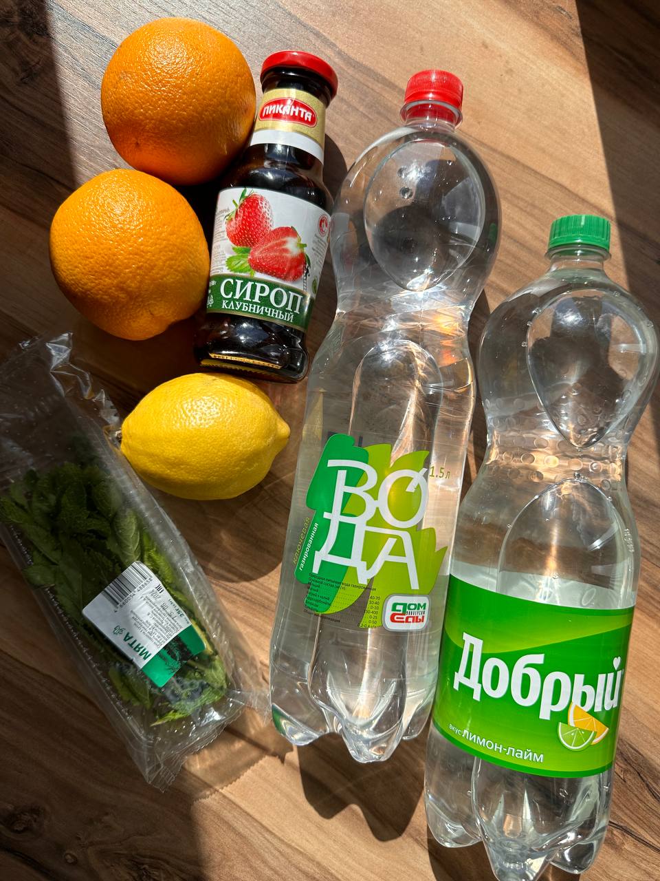 - Соединяем всё в красивой посуде - фрукты, мяту, лёд, сироп.