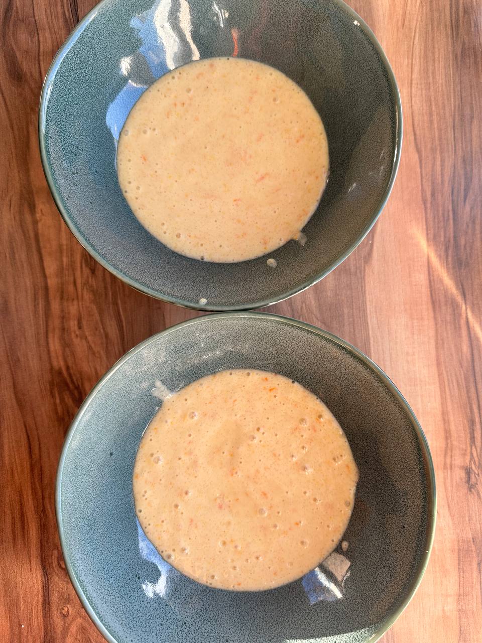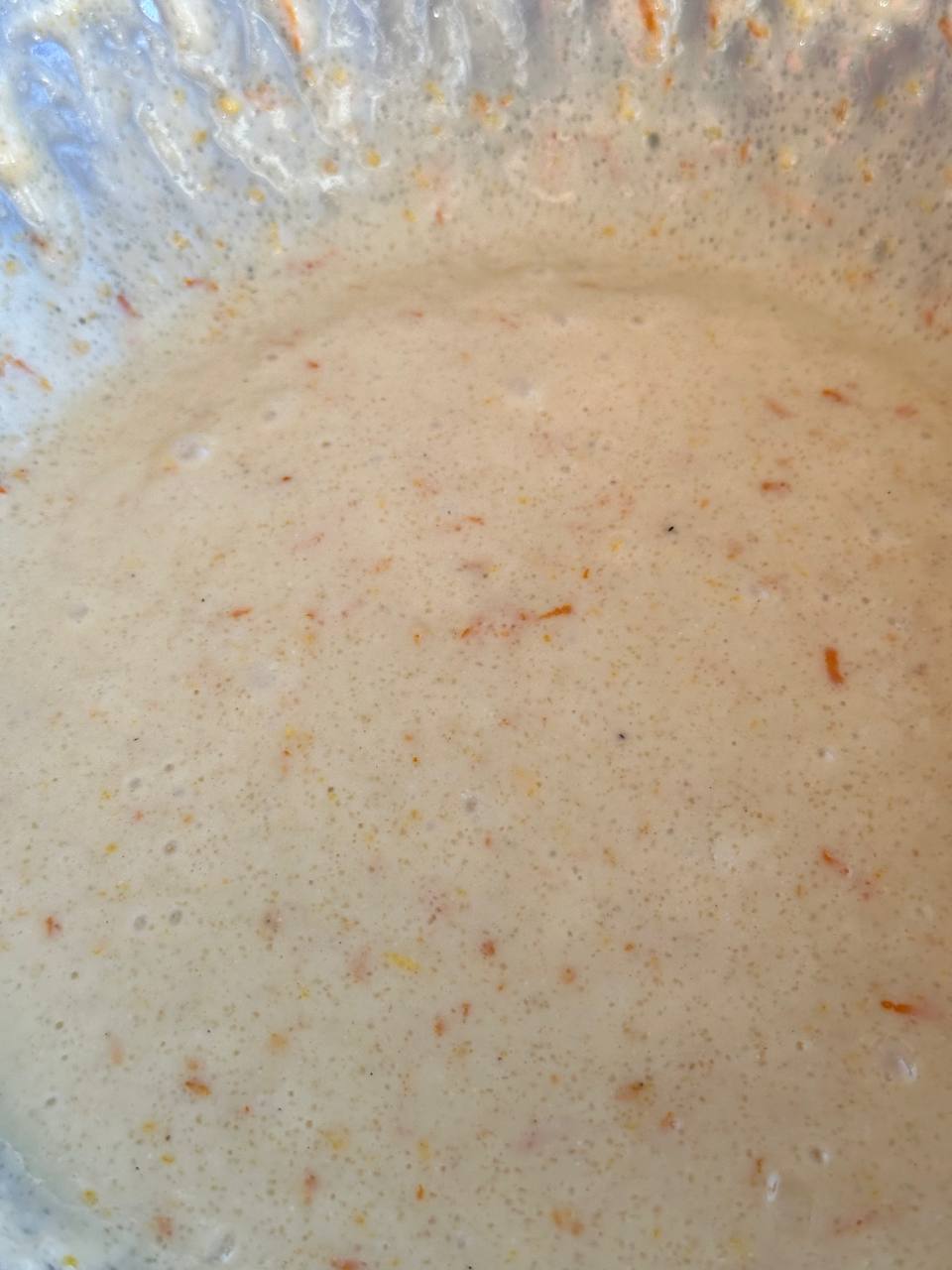 - Вливаем растительное масло и сок апельсина, медленно перемешиваем с помощью блендера до однородного состояния
