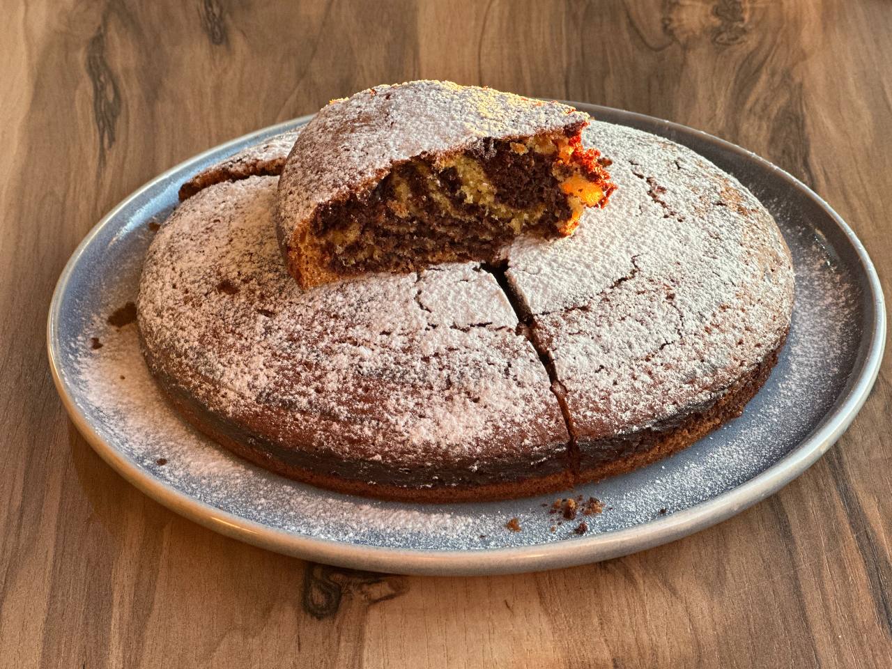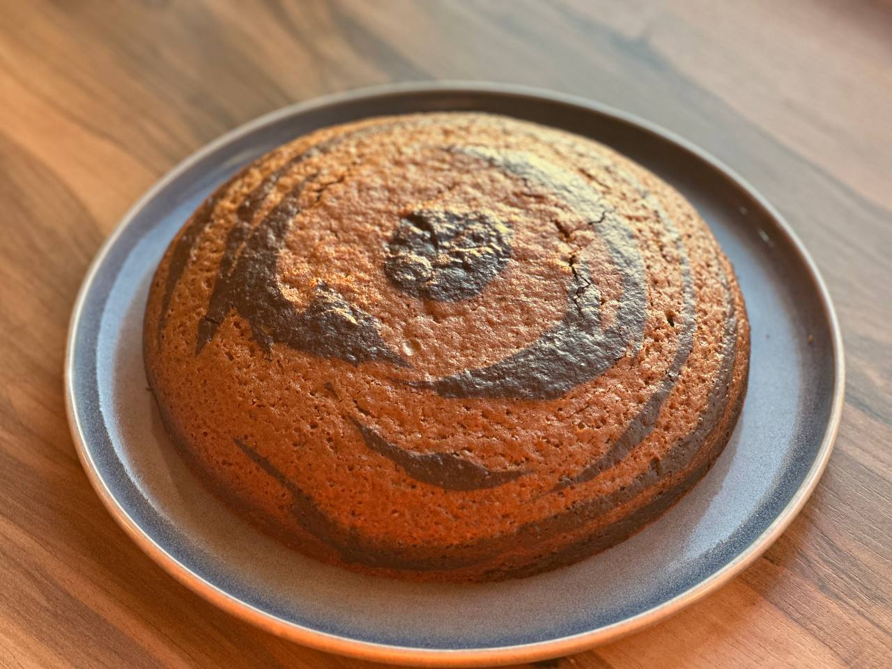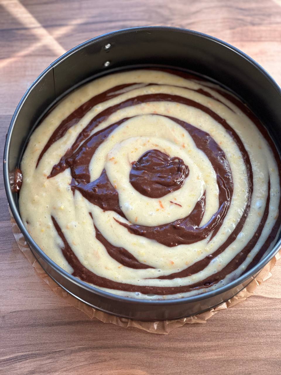- По одной столовой ложке кладем тесто в центр, чередуя смесь с какао и без