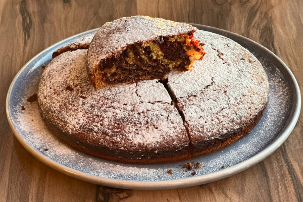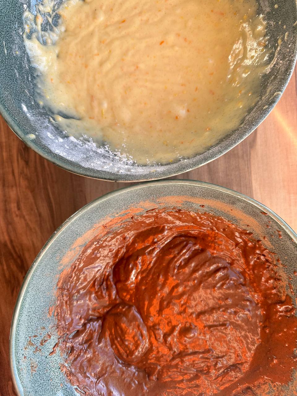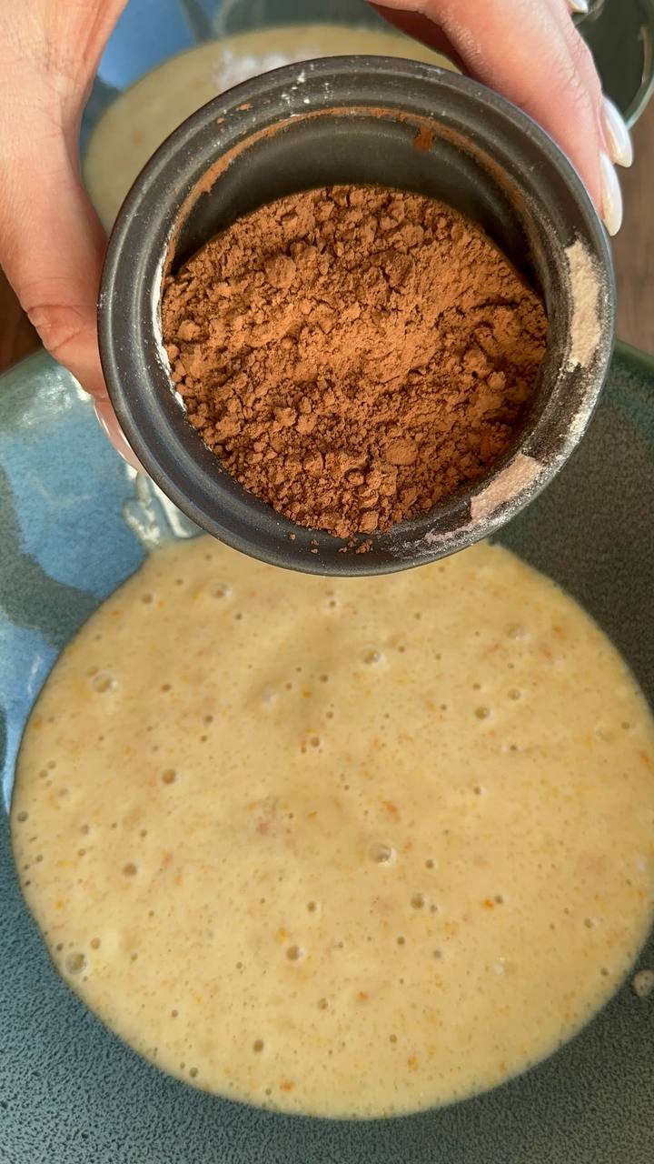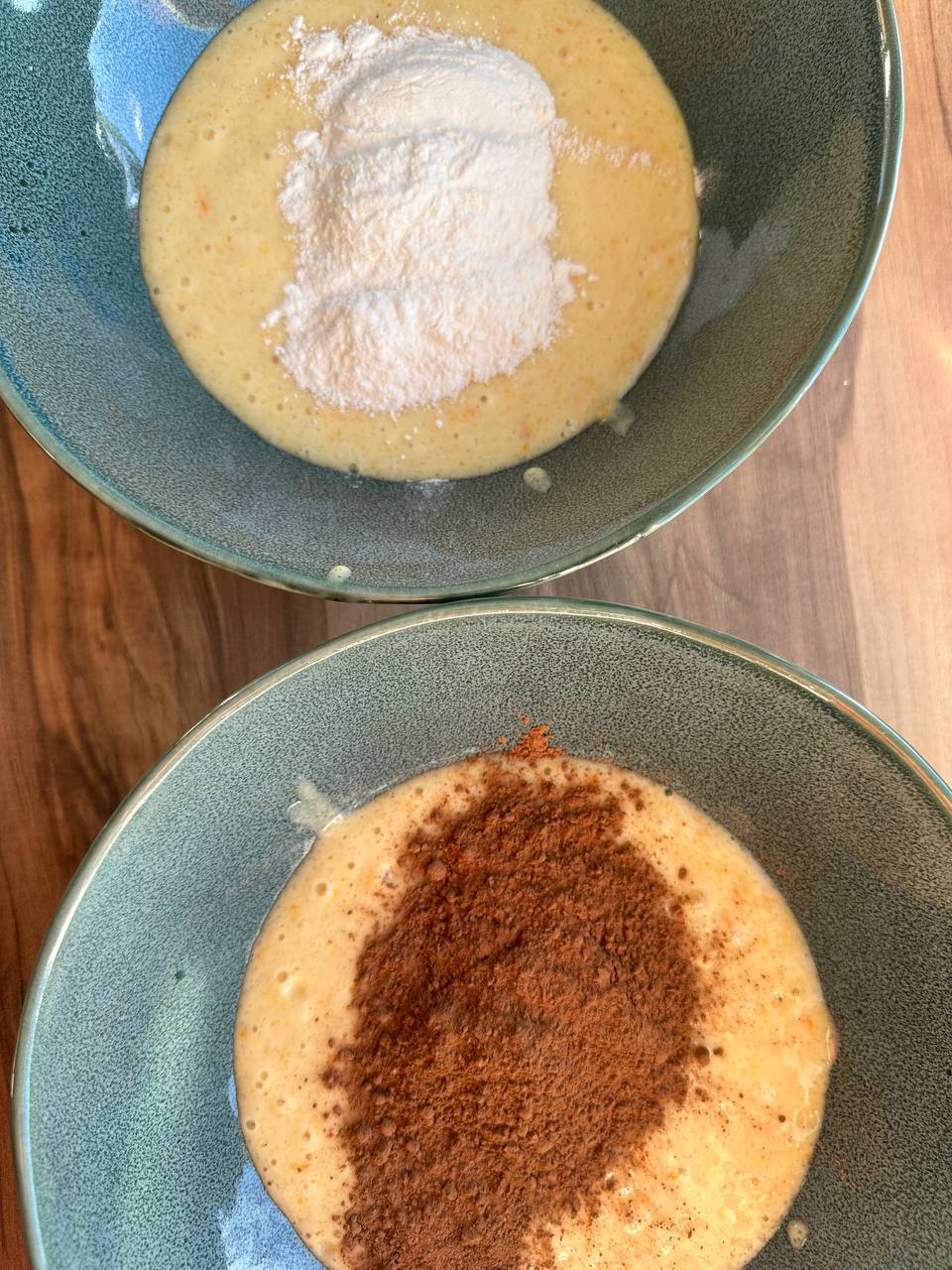 - Делим тесто на две равные части. В первую всыпаем остатки муки (30 грамм), а в другую — какао