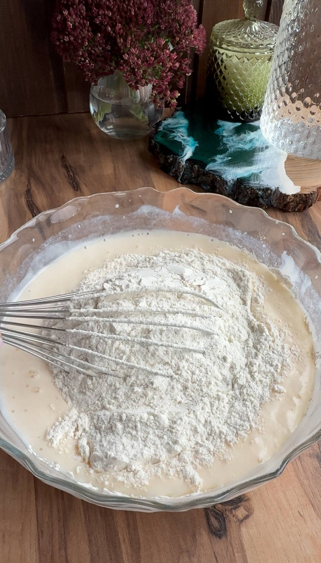 - Постепенно всыпьте муку и снова перемешайте, чтобы избежать комочков.