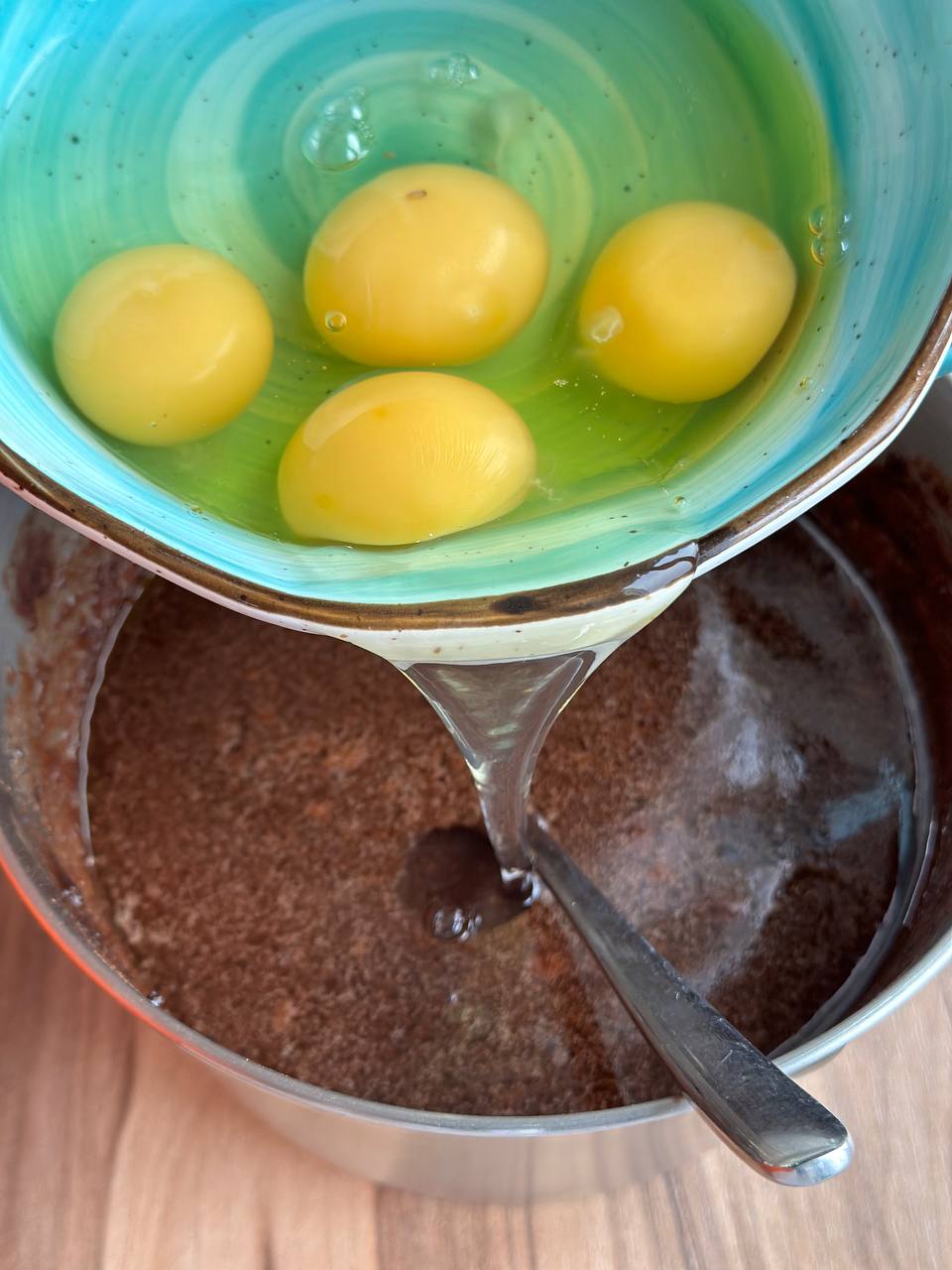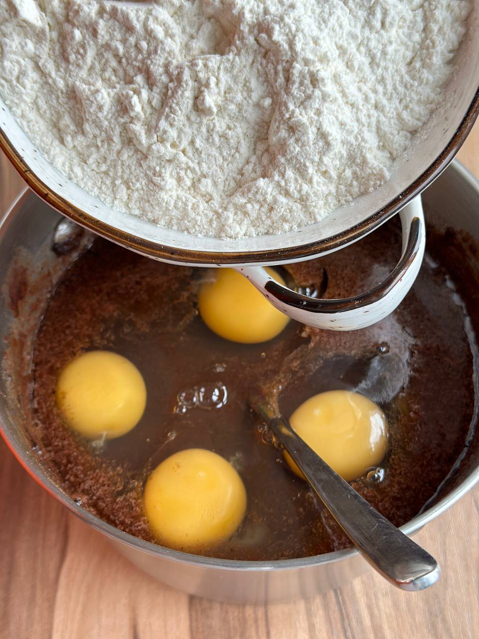 - Всыпать муку, добавить яйца, соду и лимонный сок