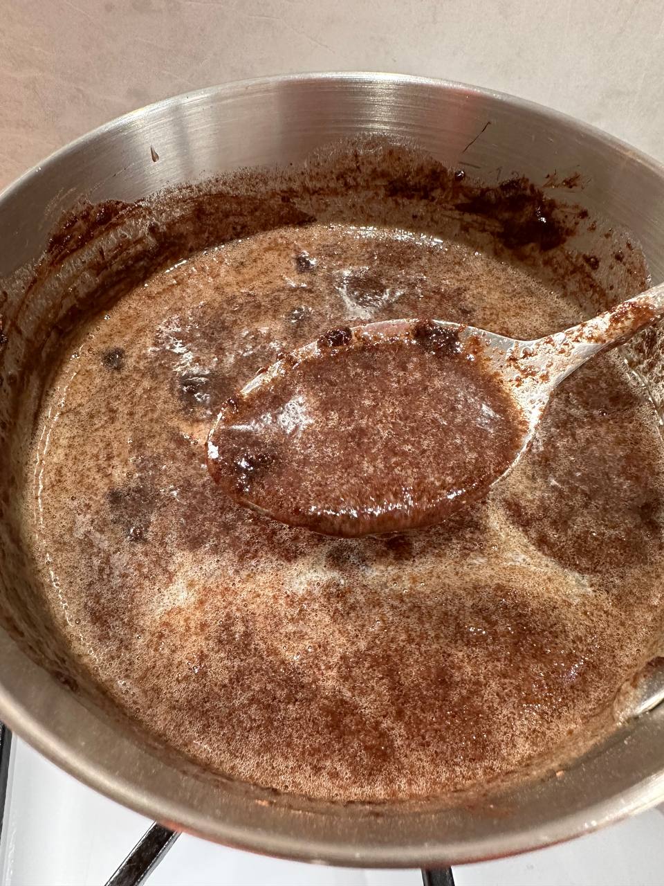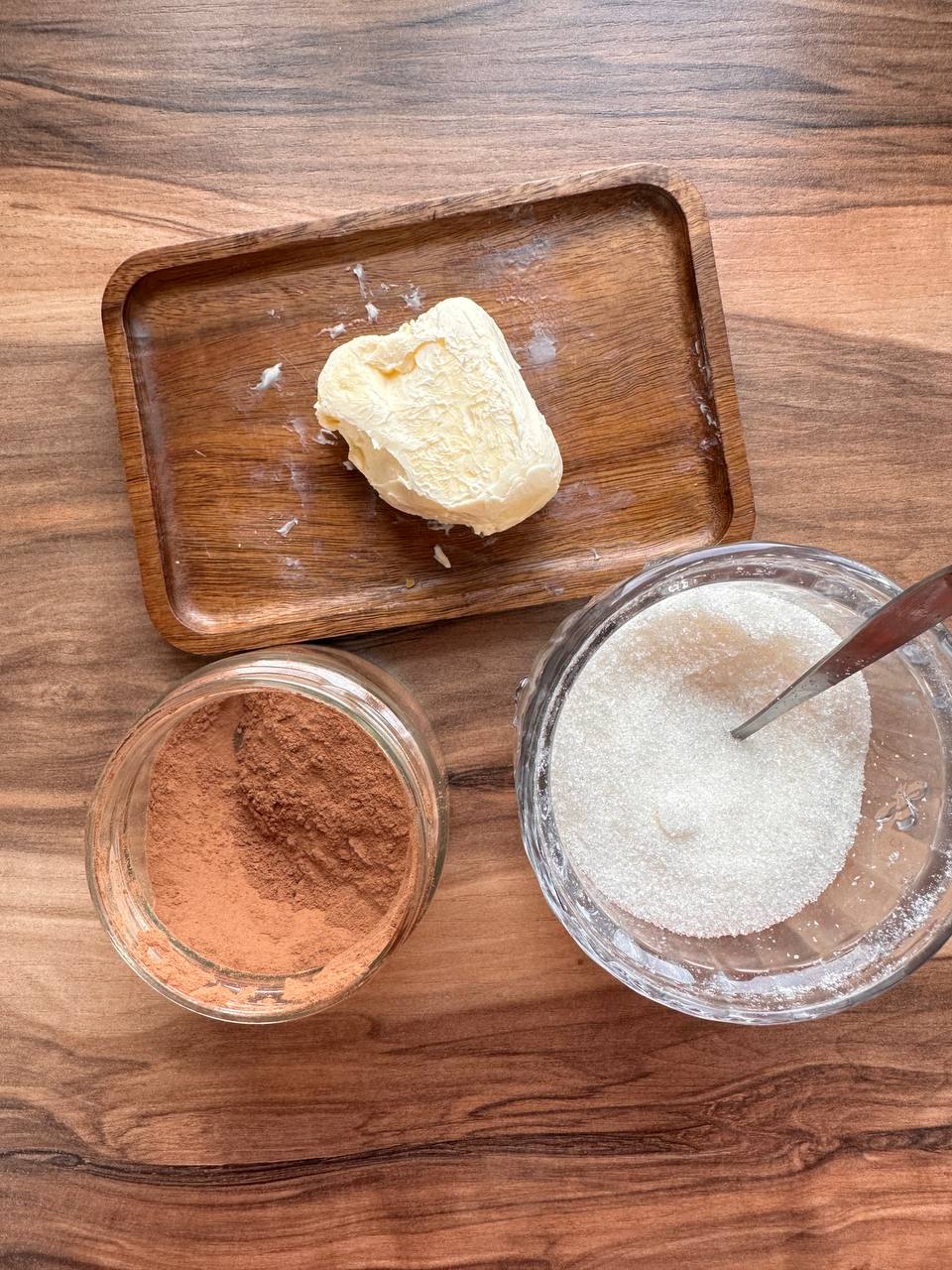 - Сливочное масло растопить и добавить к нему сахар, молоко и какао