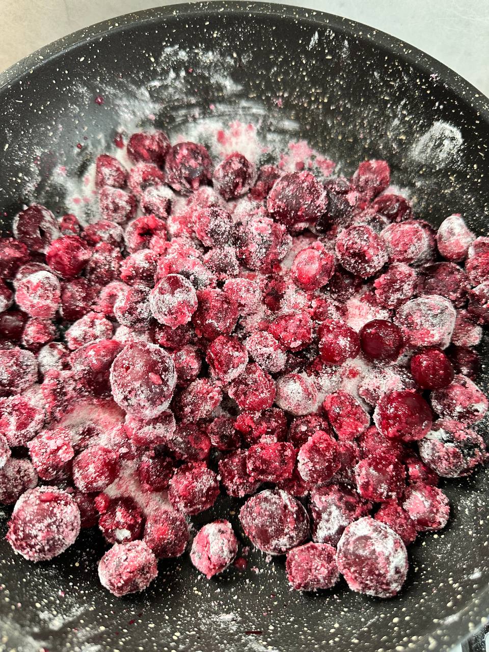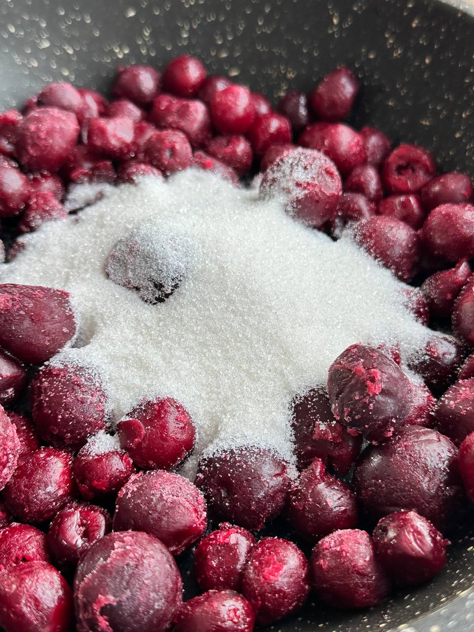 - Вишню с крахмалом и сахаром томим на маленьком огне до загустения. Помешиваем, чтобы не допустить горения сиропа