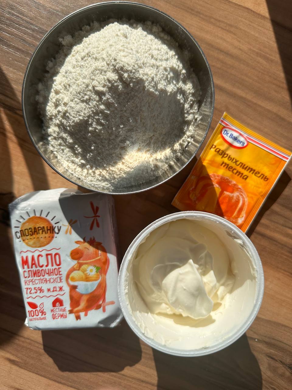 - Соединяем разрыхлитель с мукой и постепенно всыпаем в масло со сметаной