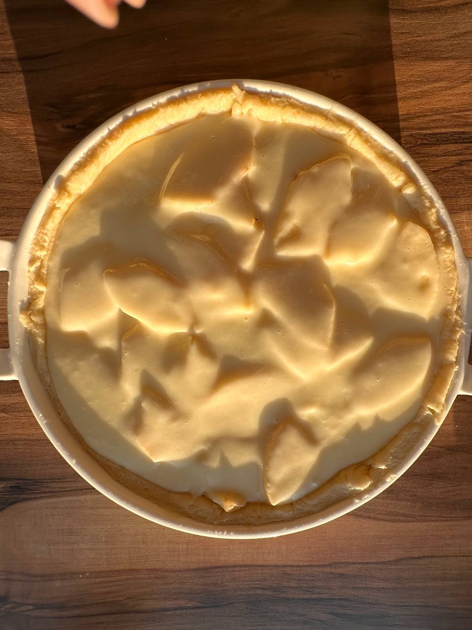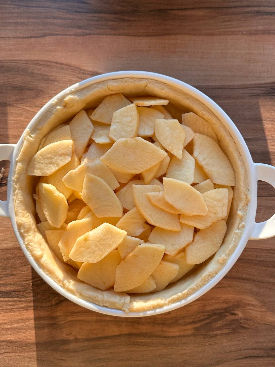 - Выкладываем яблоки и заливаем их сметанной смесью (Желательно, чтобы начинка была ниже края формы примерно на 1см)