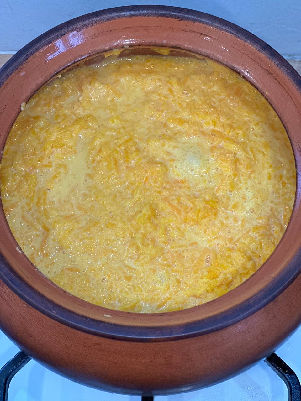 - В жаропрочный горшок налить молоко и греть на плите до закипания