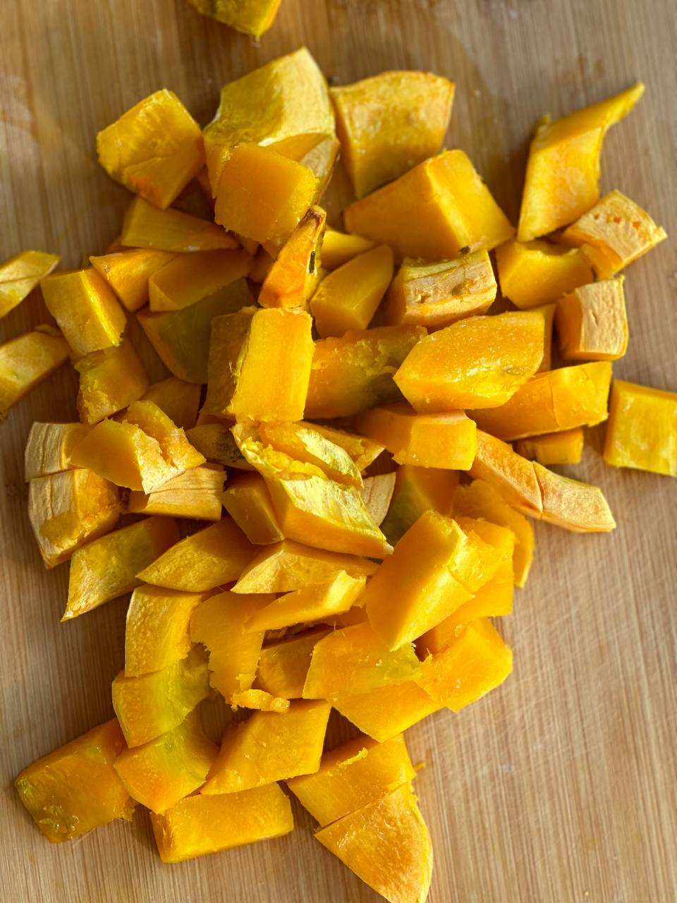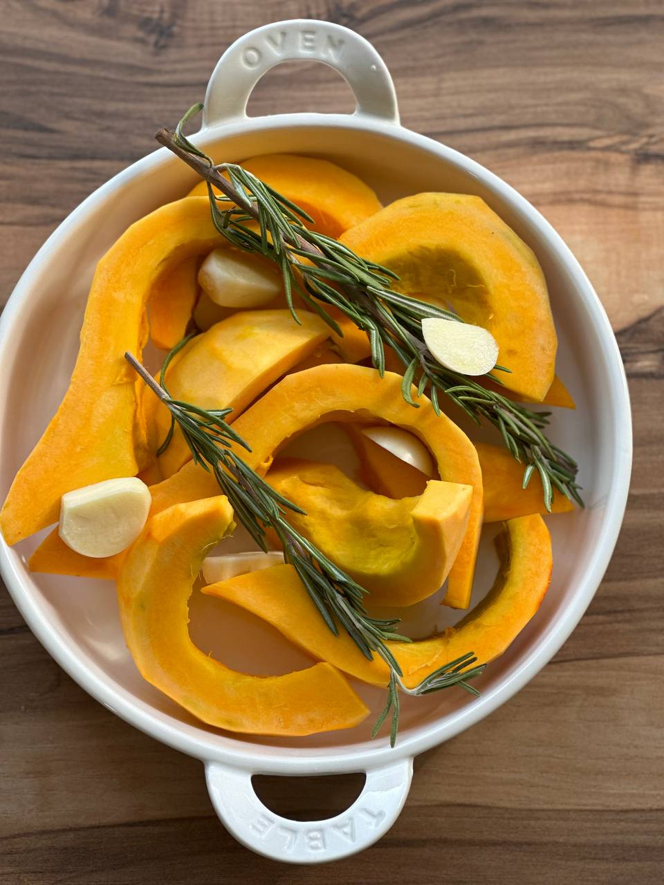 - Тыкву чистим, крупно нарезаем и запекаем в духовке с чесноком и розмарином. Прикрываем фольгой, чтобы не пригорела.