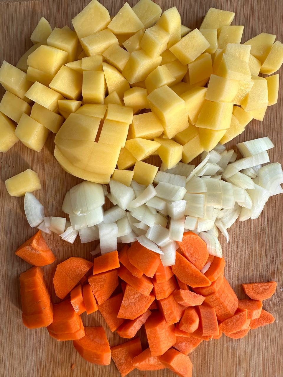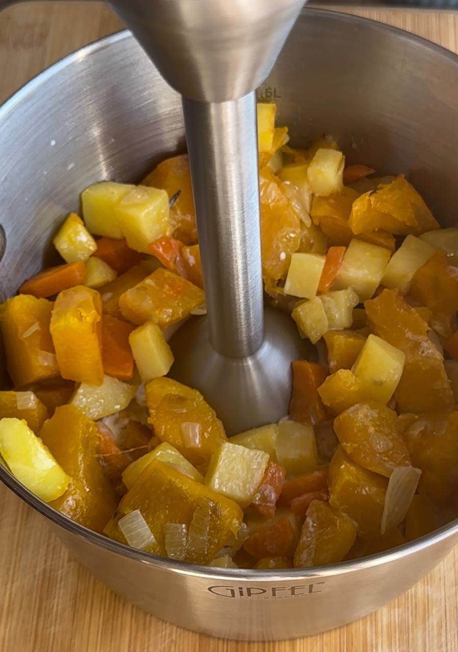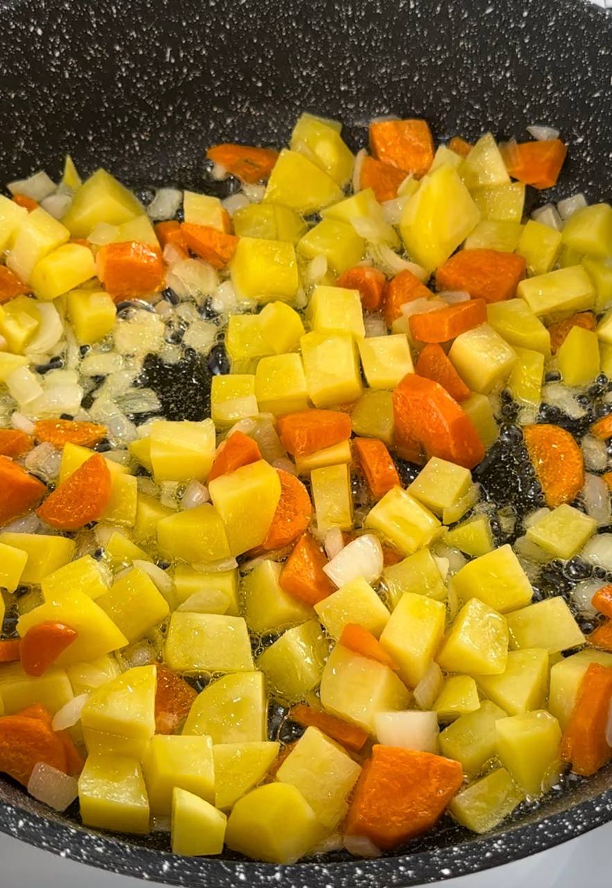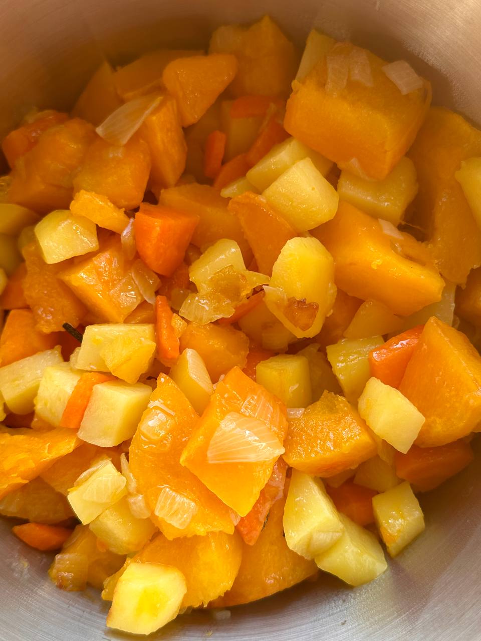 - Лук, морковь, картофель нарезаем и обжариваем. Добавляем тыкву.
