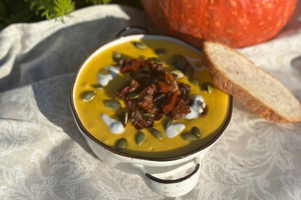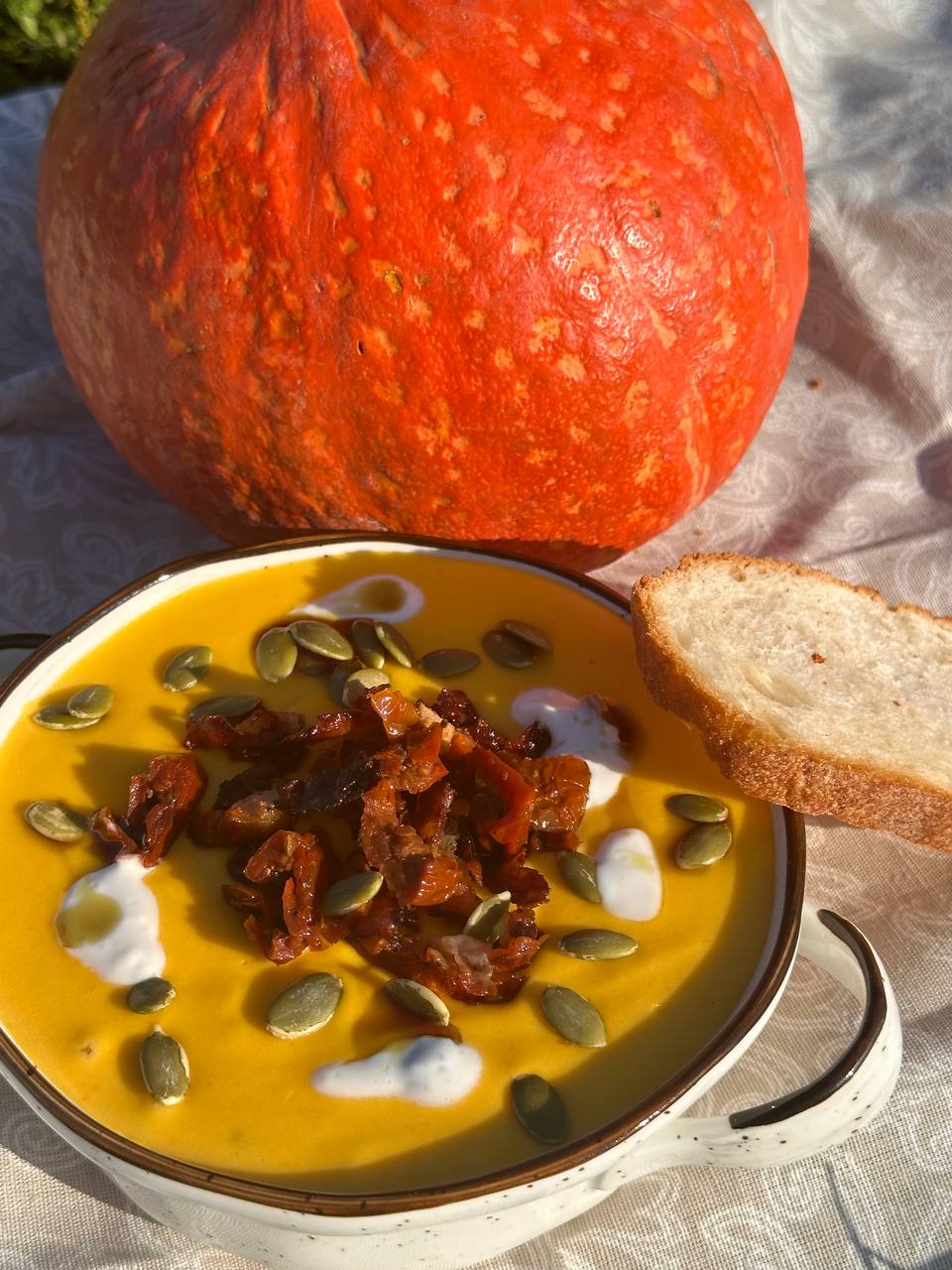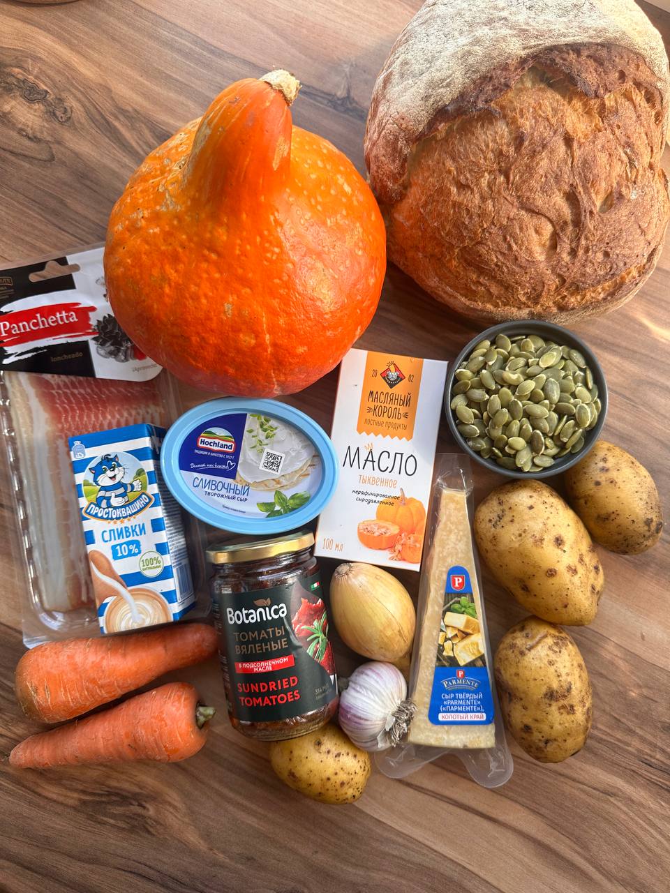 - Украшаем обжаренным до хруста беконом, вялеными томатами, сыром и семечками. Добавляем капельки тыквенного масла.